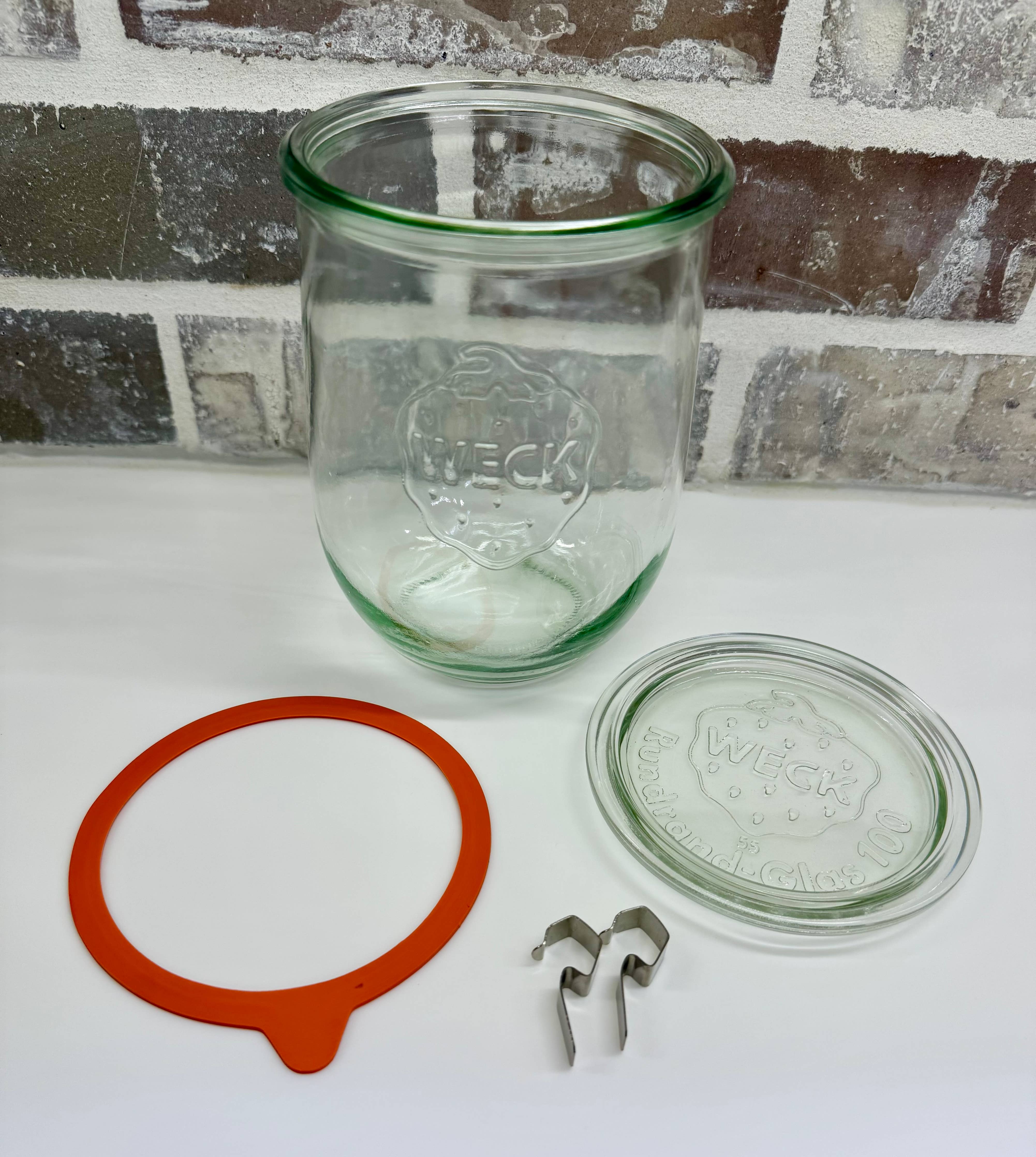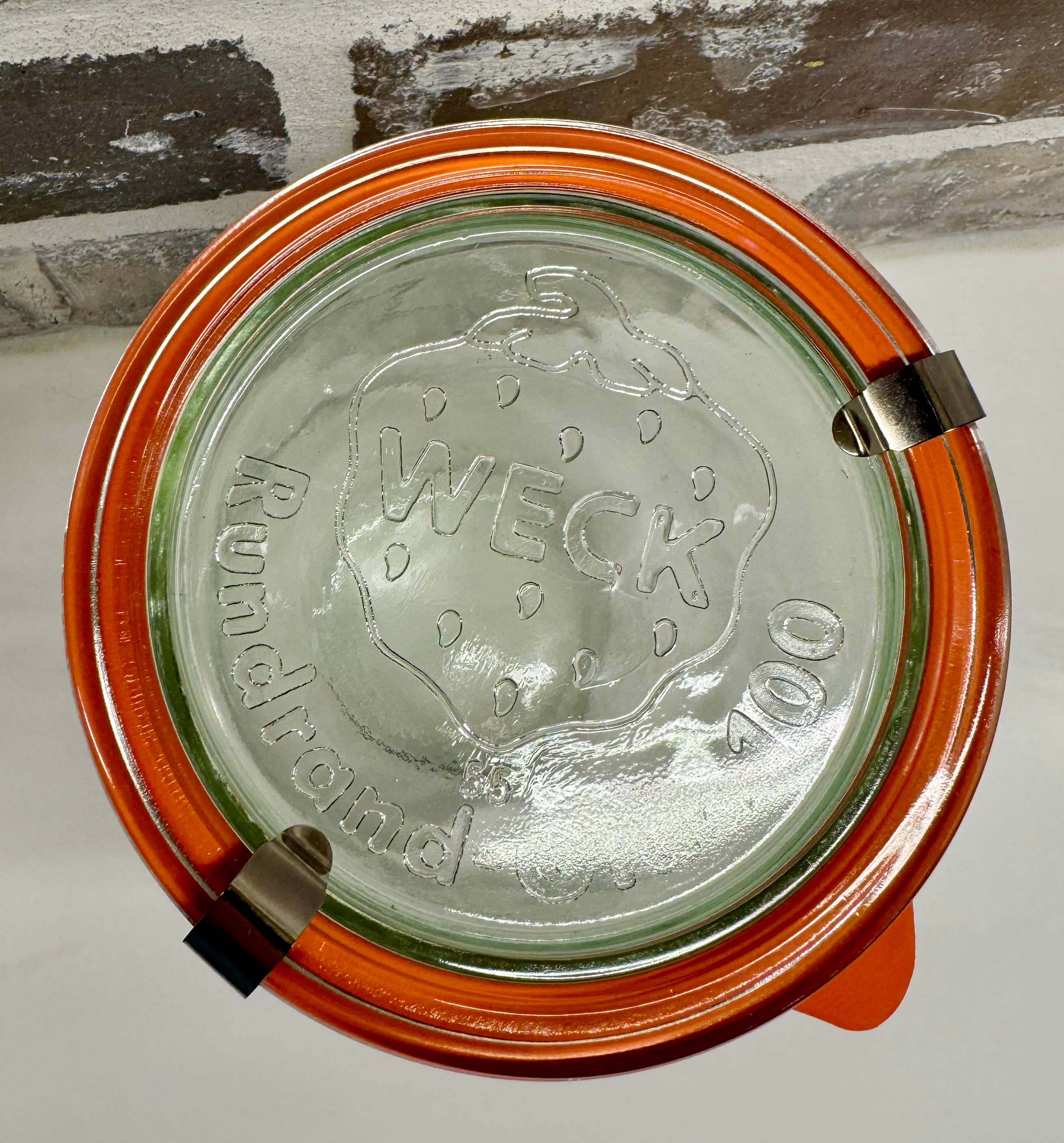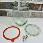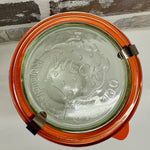 Weck Tulip jar with glass lid and orange rubber gasket. These jars have a wide lid making them great for sourdough starter, crafts, candles, or even plant pots!
