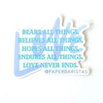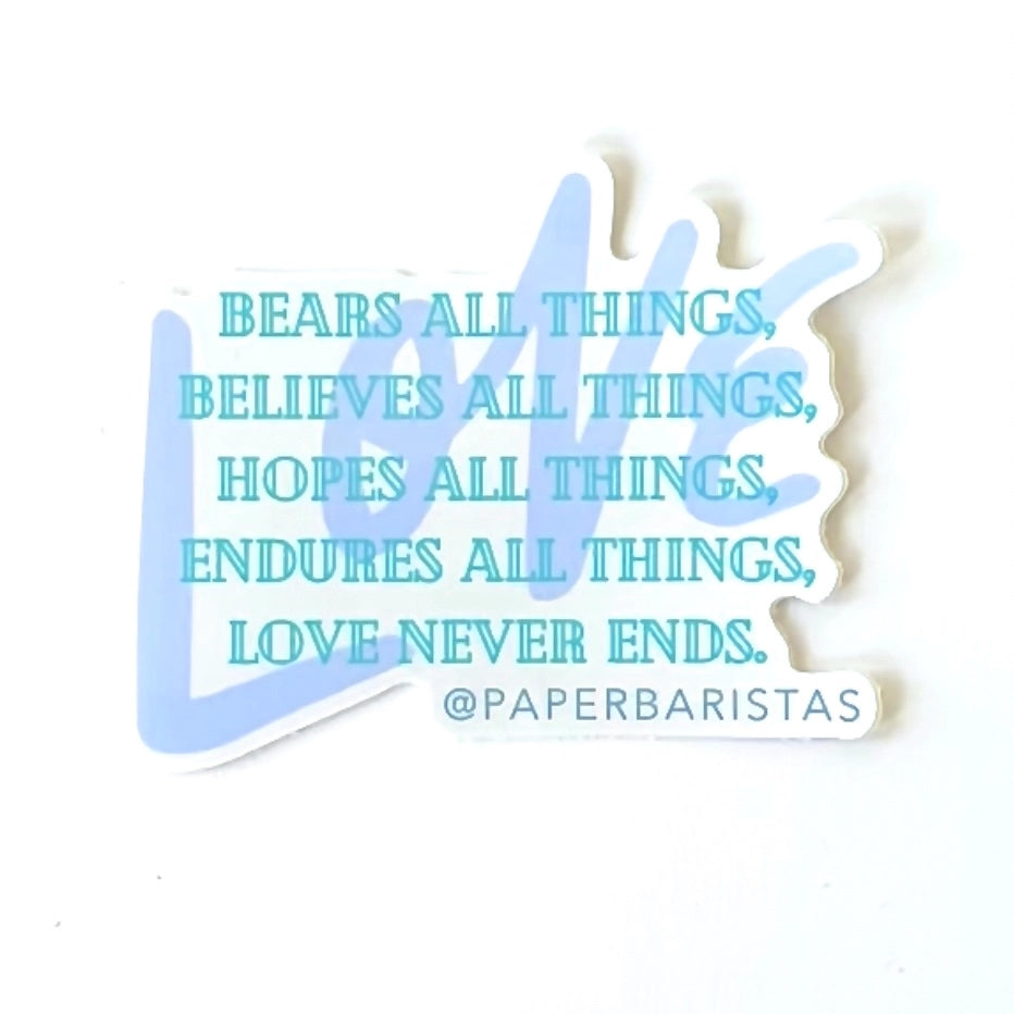 Copy: "love bears all things. Believes all things. Hopes all things. Endures all things. Love never ends.