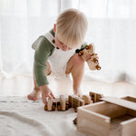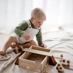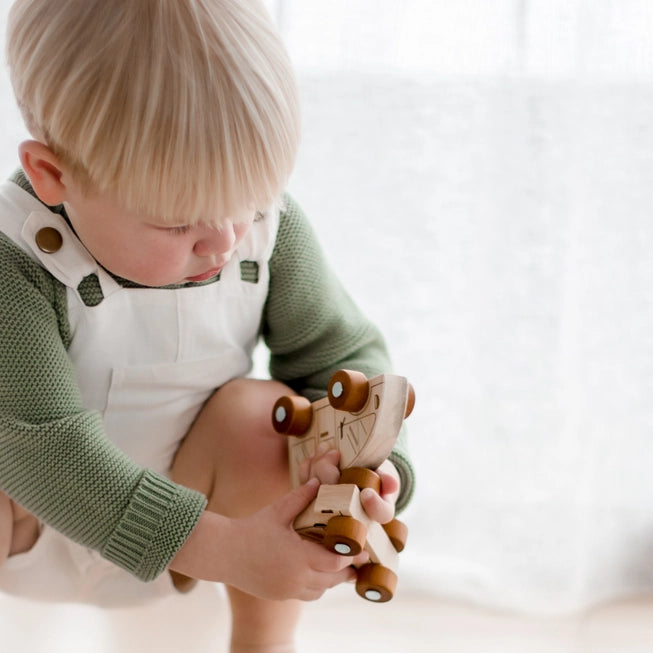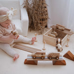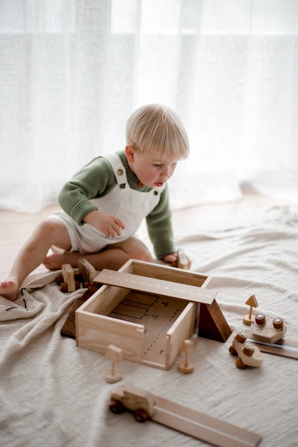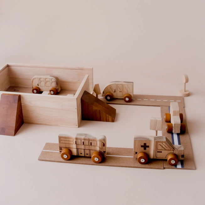 Our car play set is part of our new design. This set includes 9 vehicles, 3 roads, 4 blocks, 3 traffic signs and a reusable wooden box to store and play.