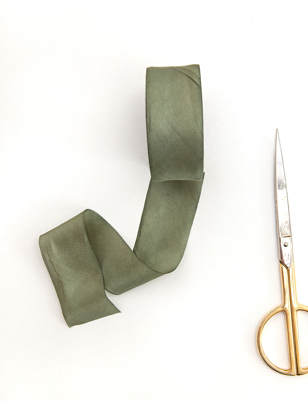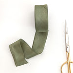 Ash Green silk ribbon. Specification 3 metres of handmade, 100% silk ribbon. Silk is cut on bias and has a natural variation in colour, with a seam every 180cm or so.