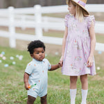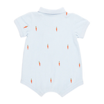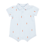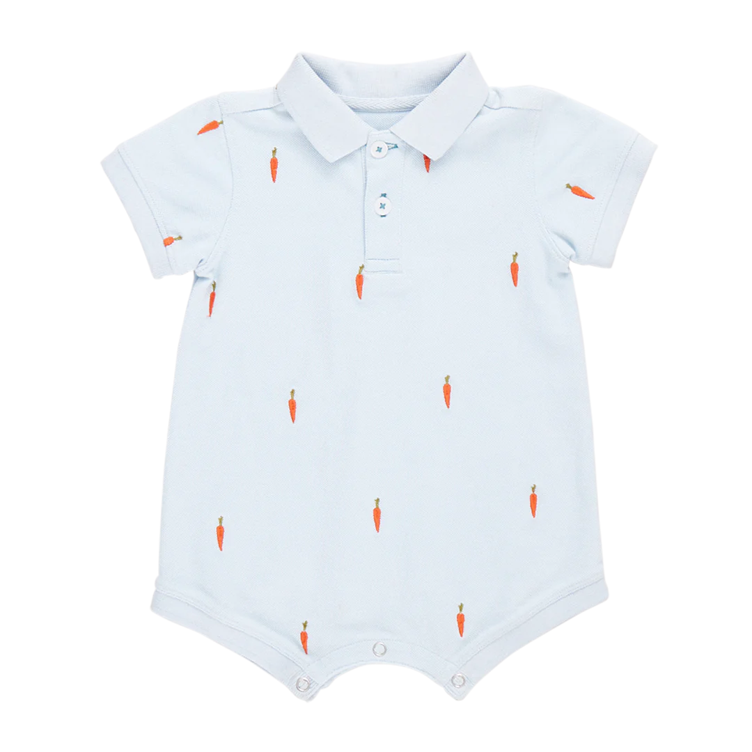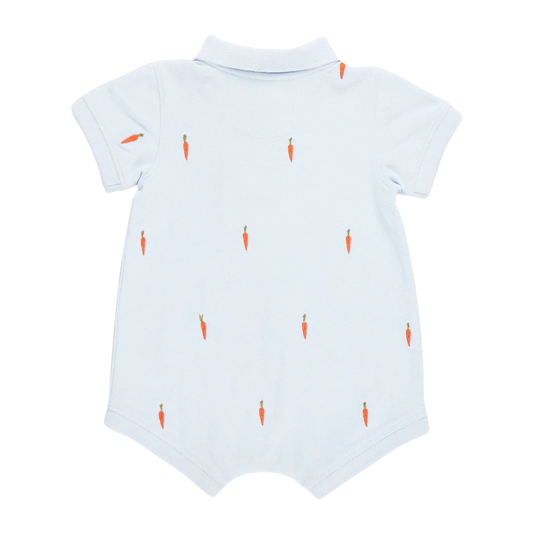 Your little bunny will look darling in this short-sleeved one-piece, crafted in a classic sky blue pique. Details include a 3/4 button closure at the front collar, soft ribbing at the arms and thighs and our signature bright blue thread detail on the top button. Ring snap closure at the legs allows for easy diapering.