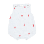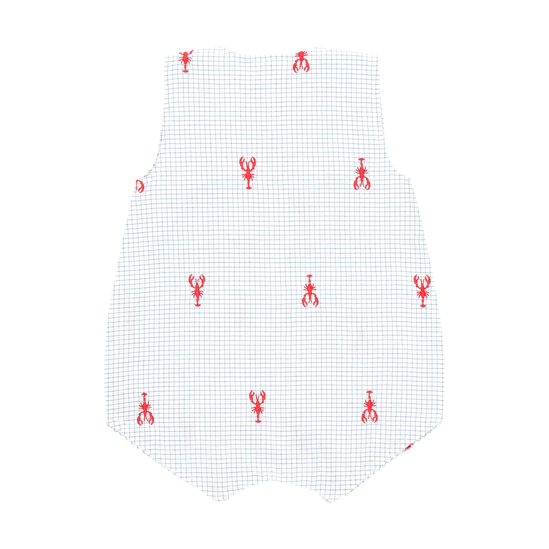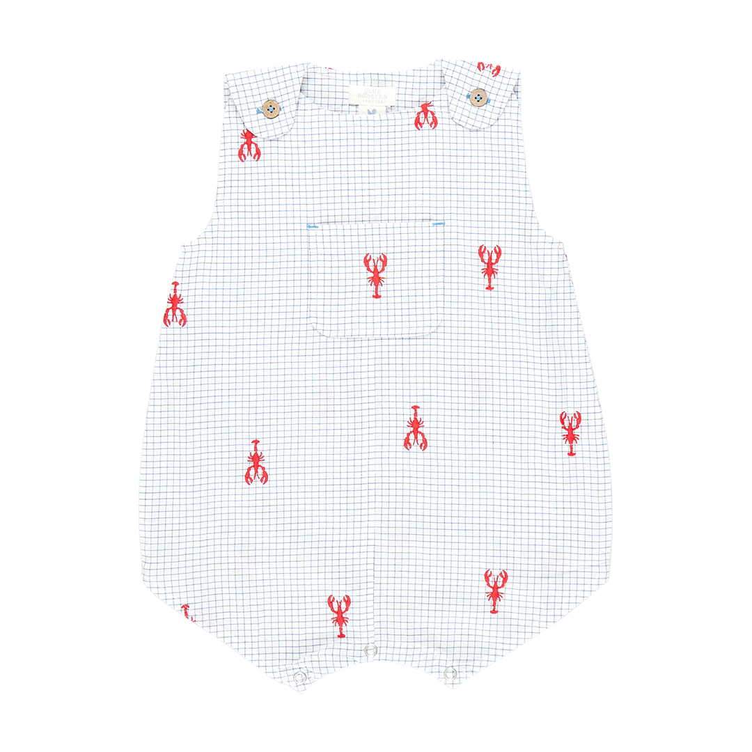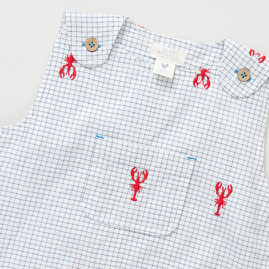 Fresh Catch! A pod of laid back lobsters swims across our classic blue and white windowpane check, shown here on our Baby Boys Noah Jumper. This fresh take on a crisp summer staple feels perfect for a picnic in the park, day or night. We love the center pocket detail, faux wood button closure at shoulder, and blue stitching on the pocket and buttons. Ring snaps at bottom allow for easy diaper changes. Placement of the embroidered lobsters is random and may vary on each item. Crafted in 100% yarn dye cotton poplin.