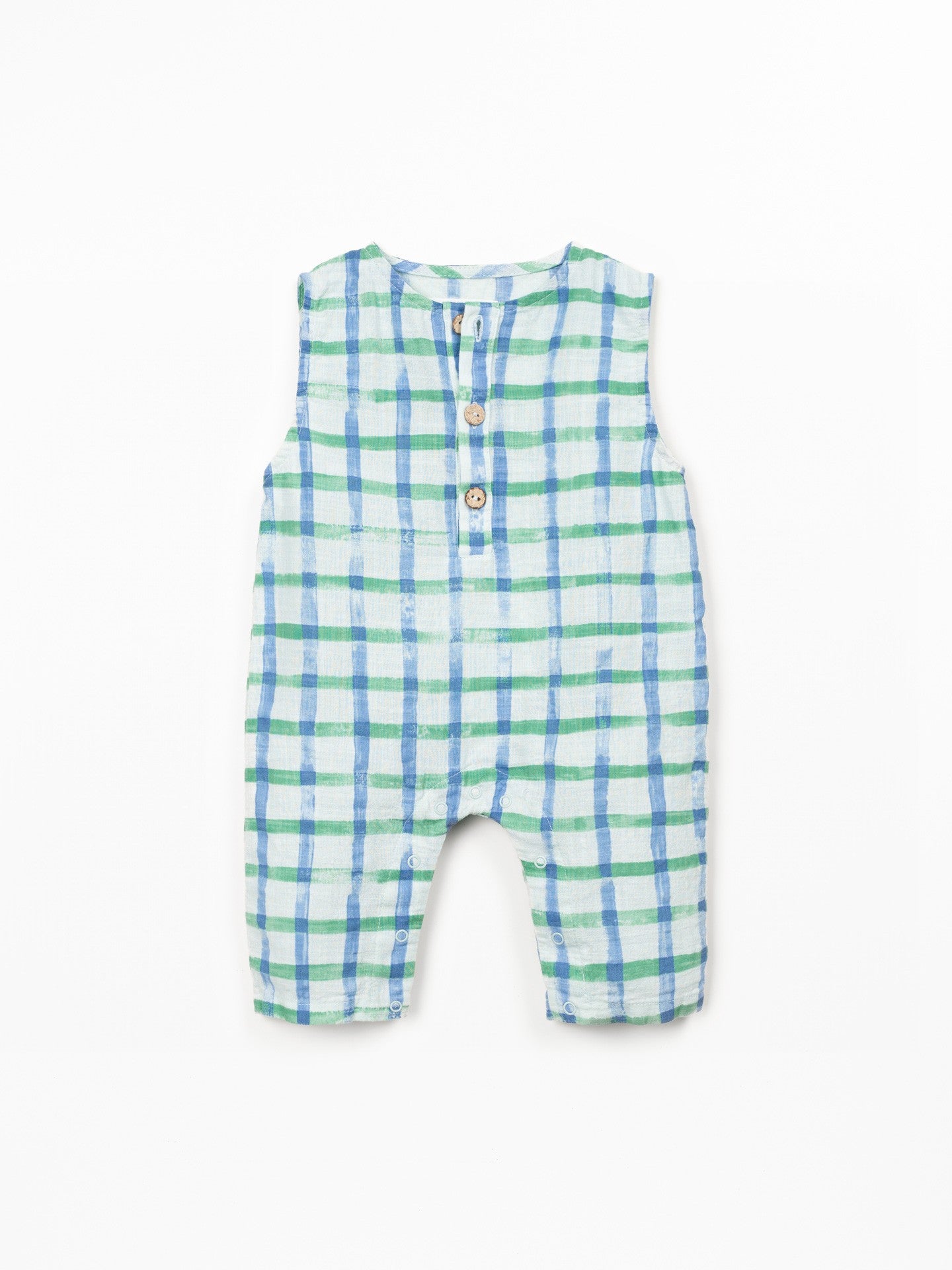 It's a sleeveless model with a round neckline, front opening with coconut buttons, opening between the legs with nickel-free metal snaps (opening between legs up to size 18M), side pockets and our checkered print.