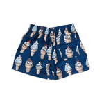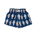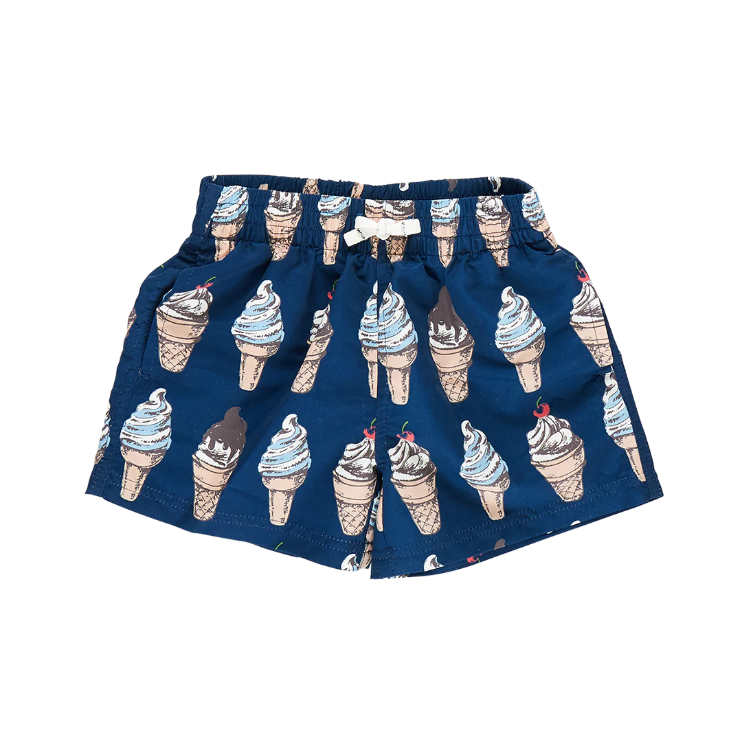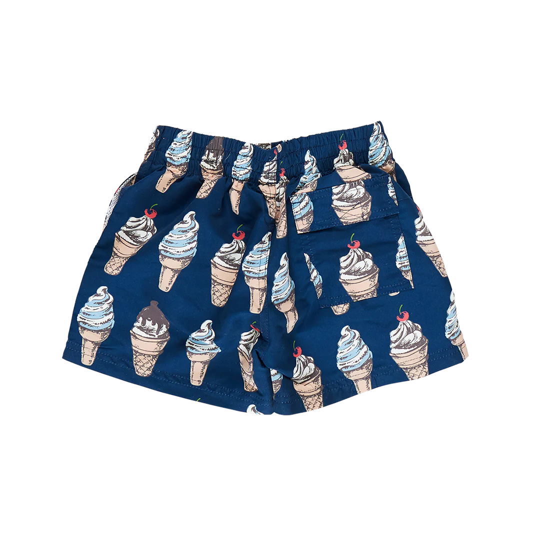 Ice Cream Social! You will want a double dip of our adorable new Soft Serve conversation print shown here against a navy ground on our Baby Boys Swim Trunk. Stylish and practical details include navy stitching on the faux front tie, mesh lined side pockets and a velcro back pocket. 100% polyester.