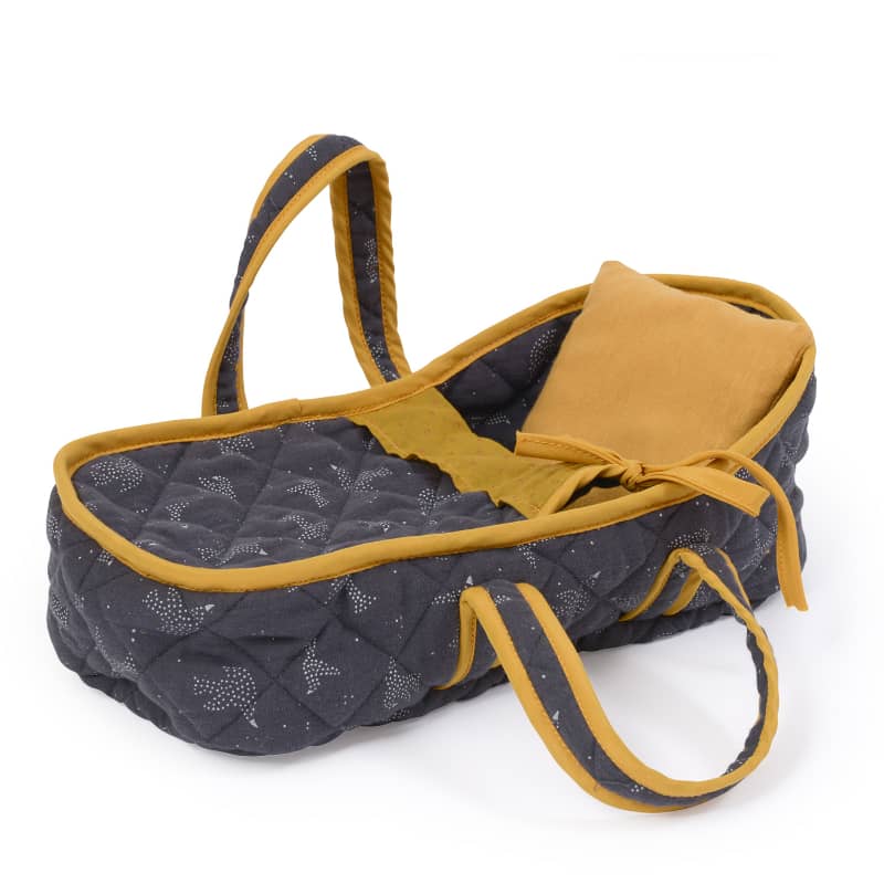 When taking baby for a walk at the park, he/she will be comfortable and warm napping in a charcoal grey quilted muslin fabric carry cot. It has two pretty carry handles with mustard yellow edging and includes a matching pillow.