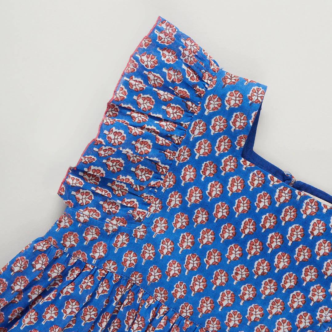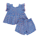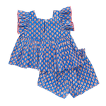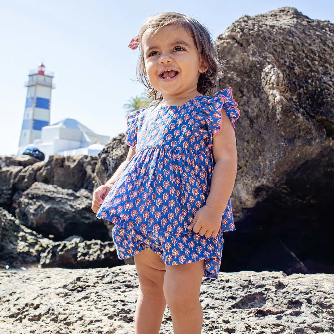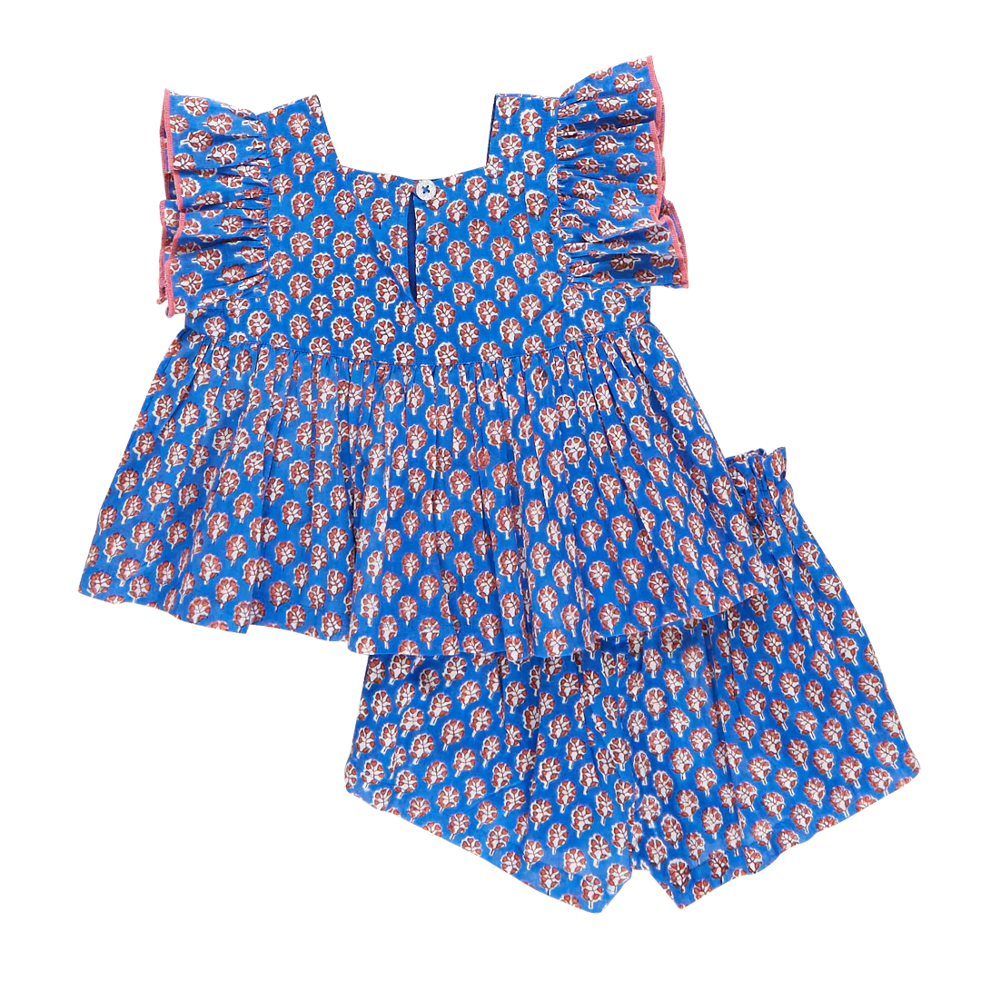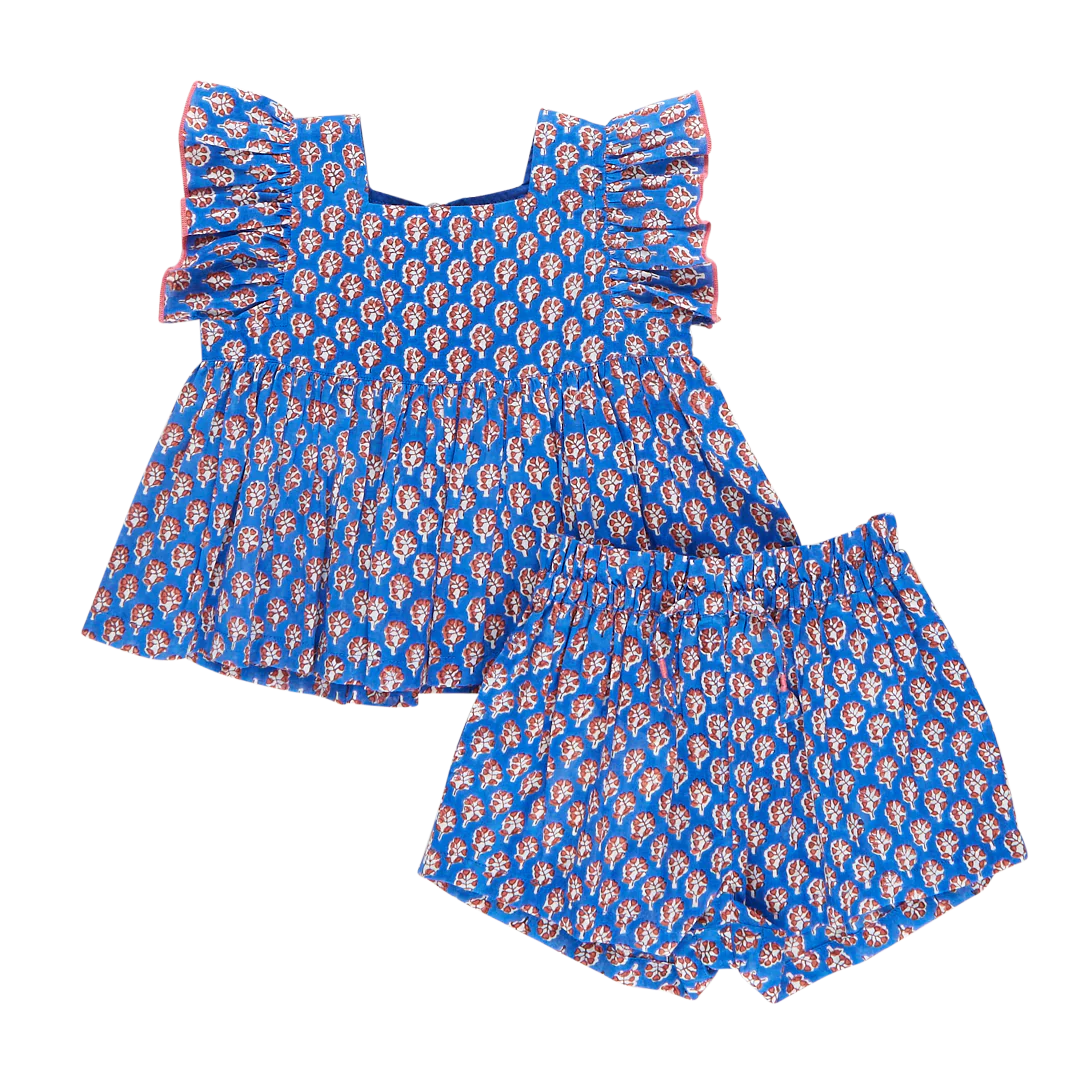 Vacation Vibes! This hand-blocked, traditional Indian block print transports you to the vibrant streets and plazas of one of Portugal's most charming cities. The crisp blue ground of our easy to wear Baby Girls Elsie 2-Piece Set is the perfect silhouette for this graphic field of coral and white flowers. Coral trim on ruffled sleeves and a fully gathered bodice define the comfortable top, while roomy side pockets and a faux tie at the waist give the elastic waist shorts a more casual feel. This set perfectly embodies Pink Chicken's boho chic aesthetic.