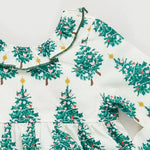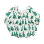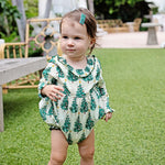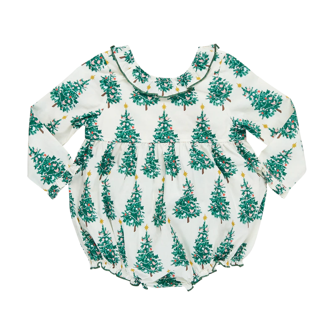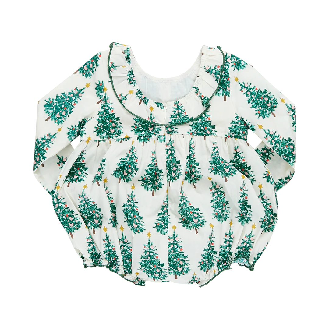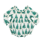 Enchanted Holiday Forest! A classic Pink Chicken silhouette, the long sleeve Baby Girls Princess Diana Bubble comes alive with sparking evergreens in our magical Festive Forest print. Distinctive details include a ruffled neckline, which dips a little lower in the back and navy trim around the neck and legs. Zips up the back. Ring snap closure at legs for easy diaper changing.