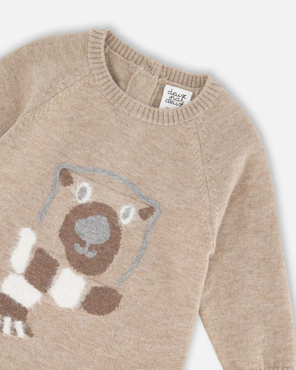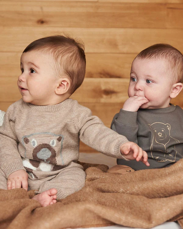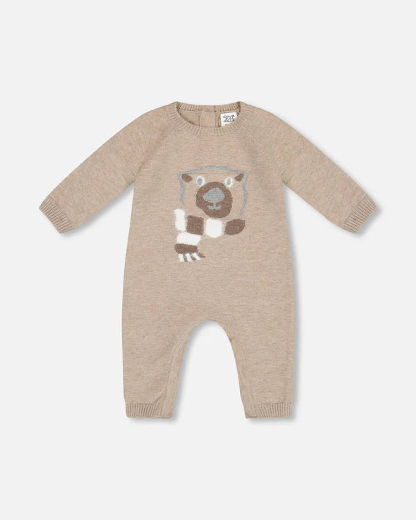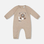 Our Knitted Bear Jacquard Jumpsuit Sand is perfect for days that call for cozy knit sweaters! This one-piece features long raglan sleeves, a round neckline, and a jacquard bear face on the chest. We’ve finished it with soft rib knit trim at the cuffs, neck, and hem.