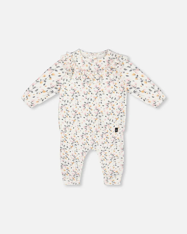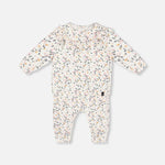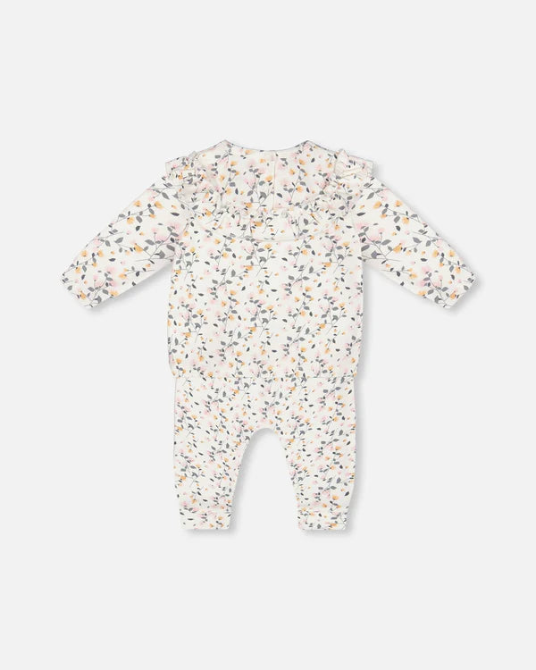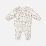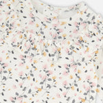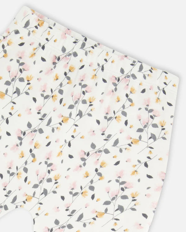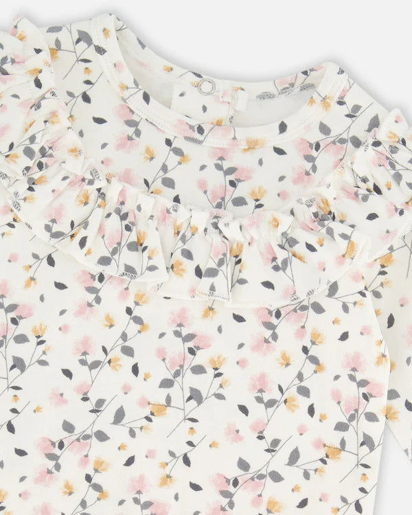 A fresh floral print adds one-of-a-kind charm to out Organic Cotton Top and Pants Set Cream with Flowers. This adorable matching set features a long sleeve top with a round neckline, snap closures at the back of the neck, and a ruffled yoke. An elastic waist pant with band ankles offers head-to-toe coordination!