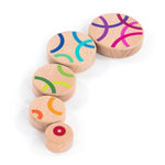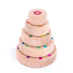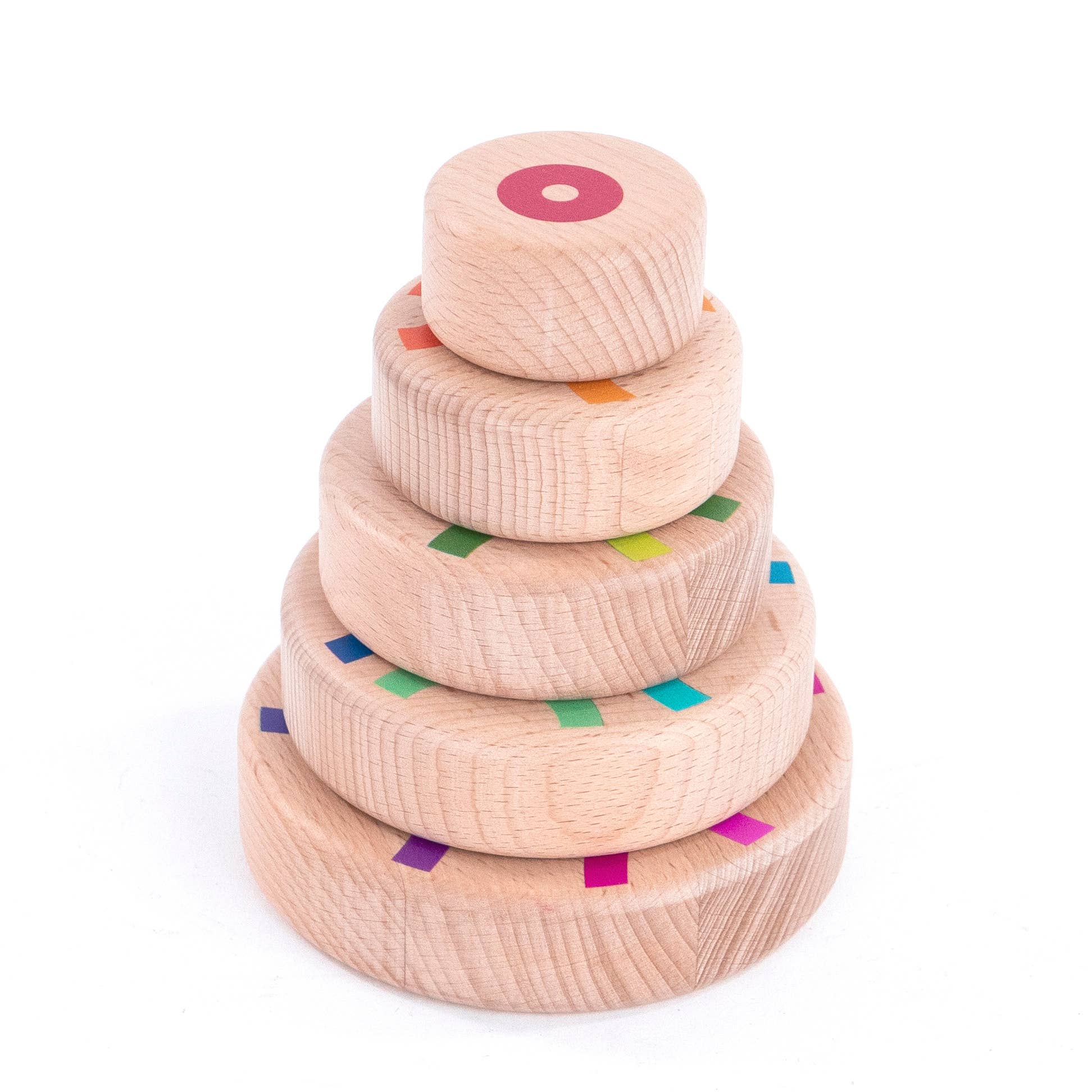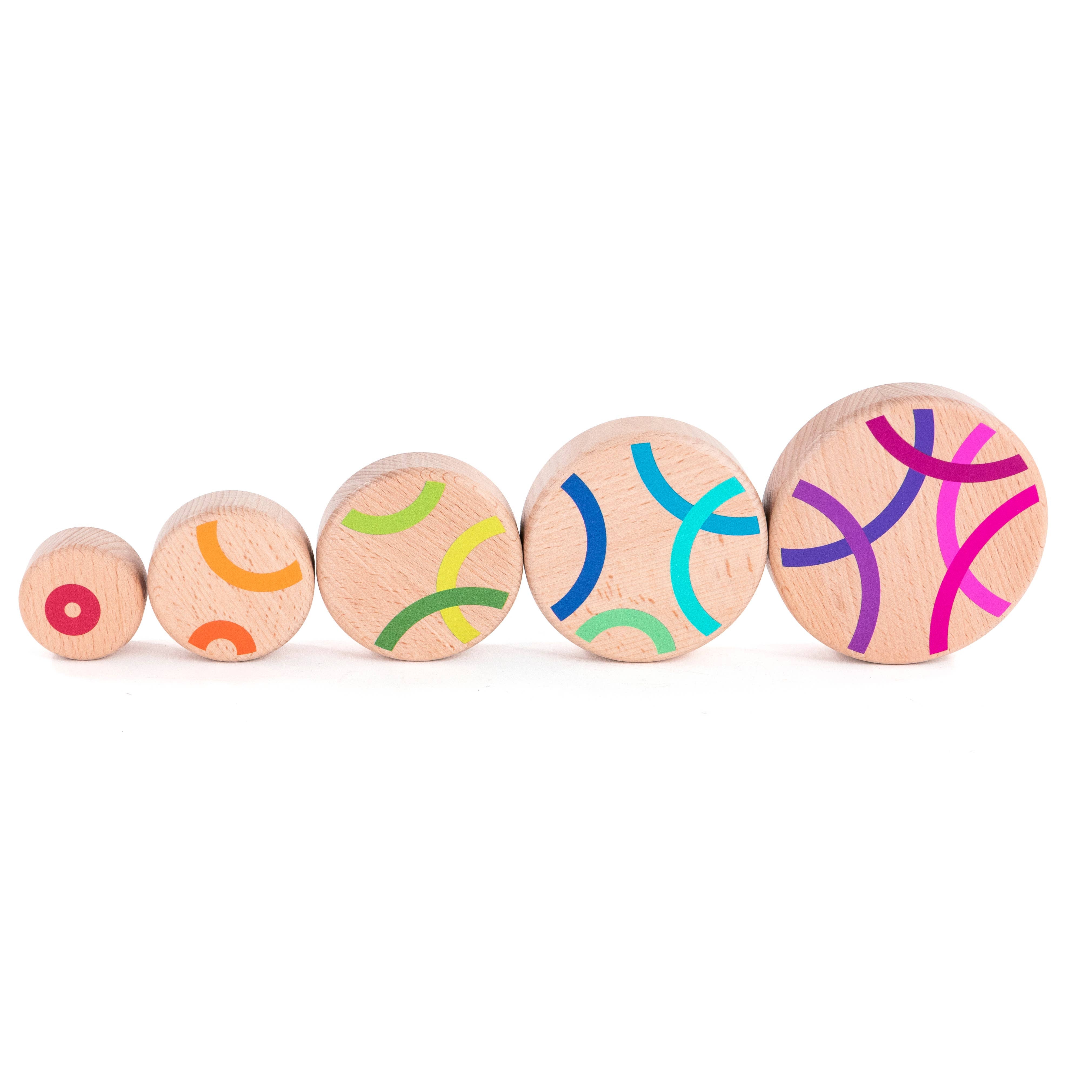 The N-S magnetic pyramid, a toy composed of 5 circular pieces that allow children to safely explore the power of magnets and gives them the opportunity to discover not only the principles behind this force of nature, but also develop an appreciation of shapes, patterns, and colors.
