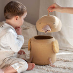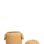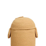 The cutest little chicken made of braided cords! Handcrafted using a braided cord made of fibers from recycled PET bottles mixed with our cotton yarns in soft Golden color, the Charlie the Chicken basket has a beak and braided legs in Rose, and tufted yellow wings.