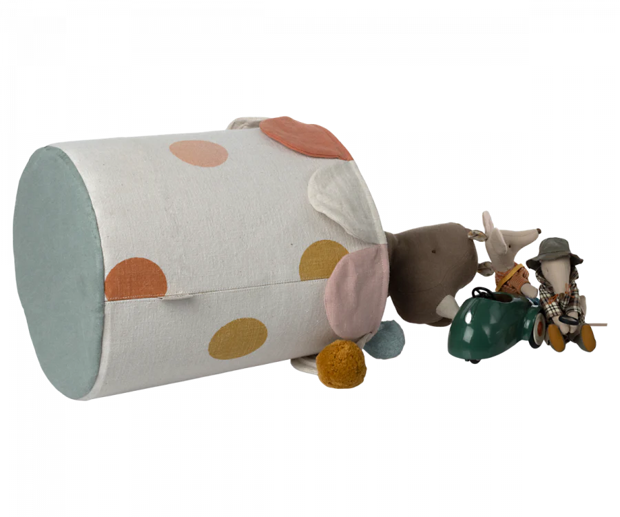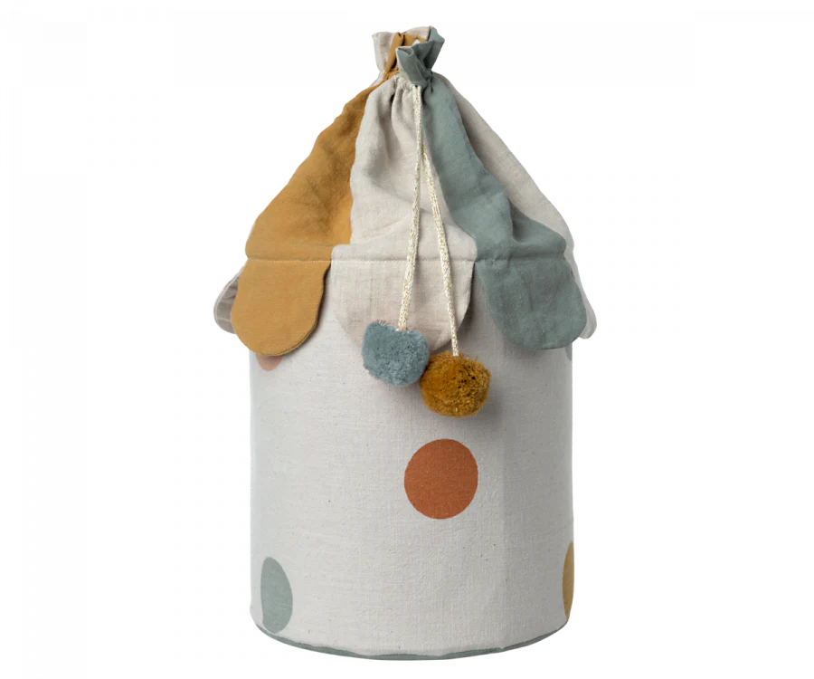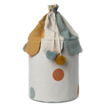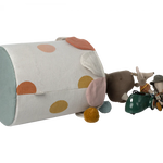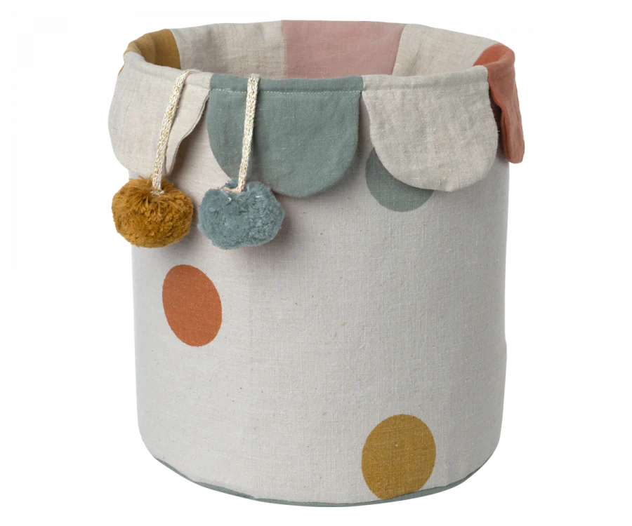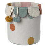 This colorful, soft basket is the perfect storage for any playroom. Close the basket to hide the mess! This basket comes in two color versions, one with a rose and one with a chinos green bottom.