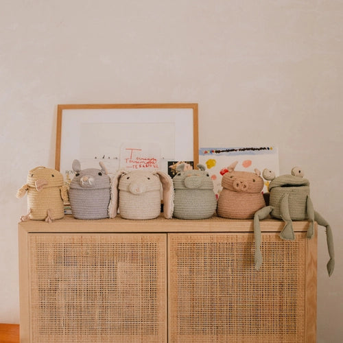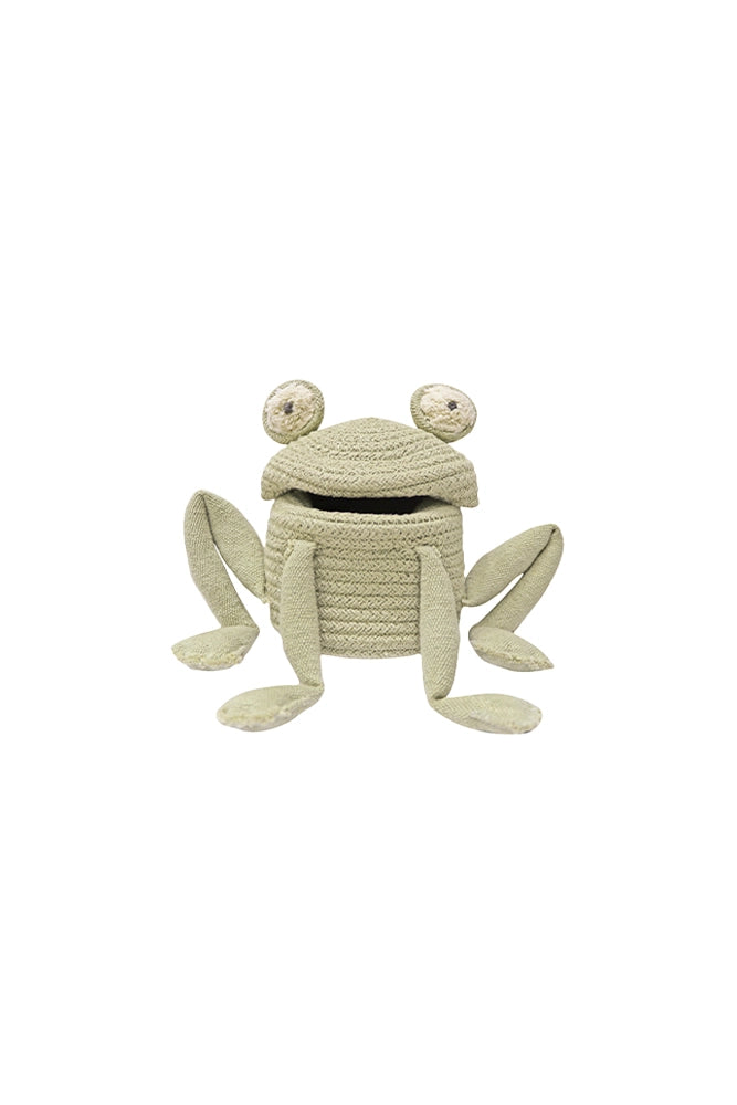 Mini Fred the Frog basket has big cotton pompom eyes, and olive canvas stuffed legs. A practical sized basket to fit on your shelf and keep your little treasures well hidden.