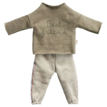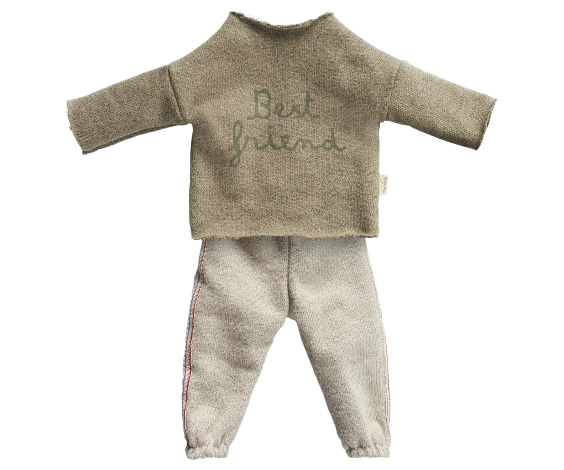 Lounge out with your Maileg Best Friend with this super cute track suit! Green top with sweat pants that have a stripe detail on the side.
