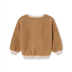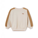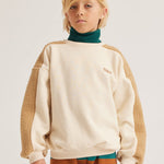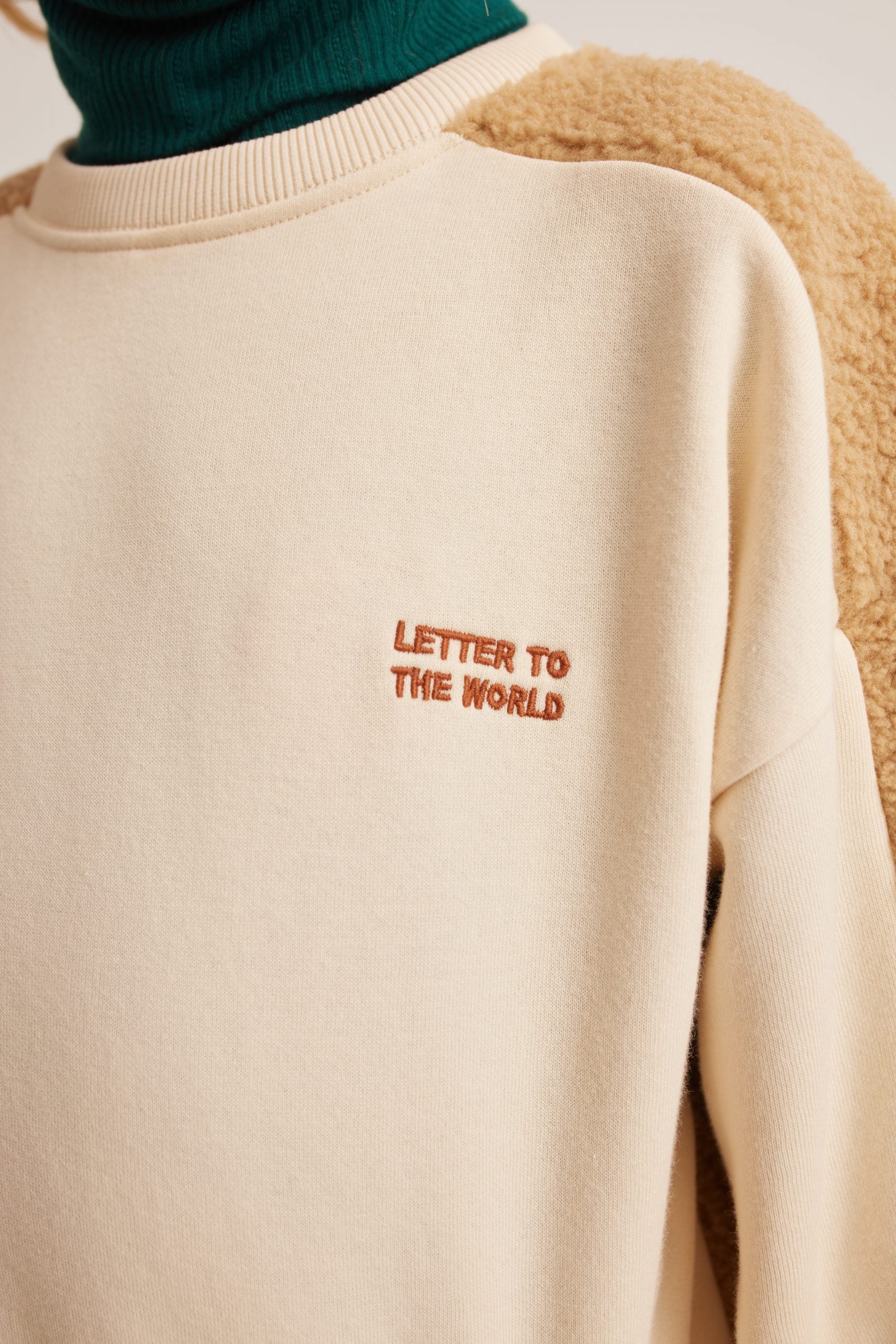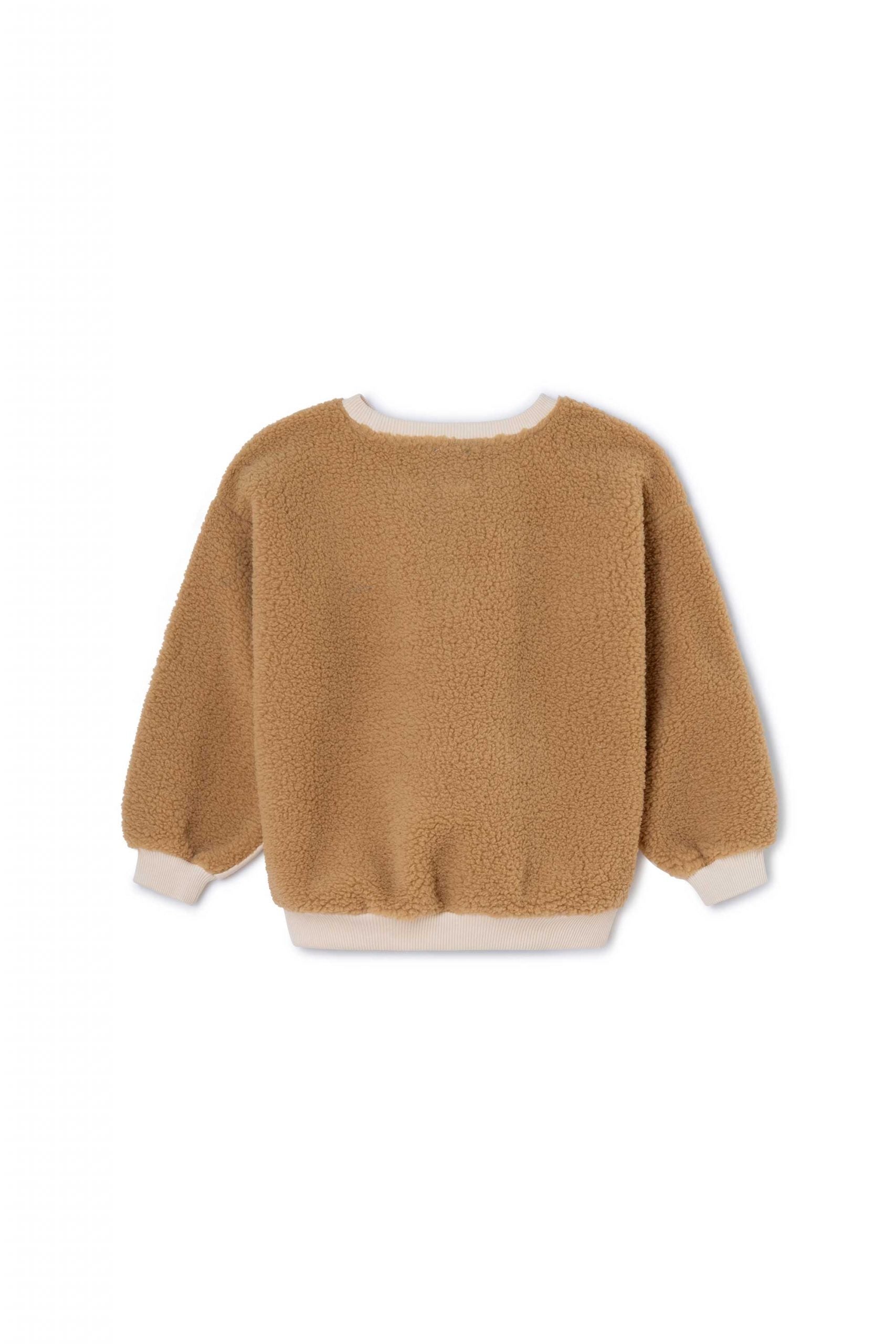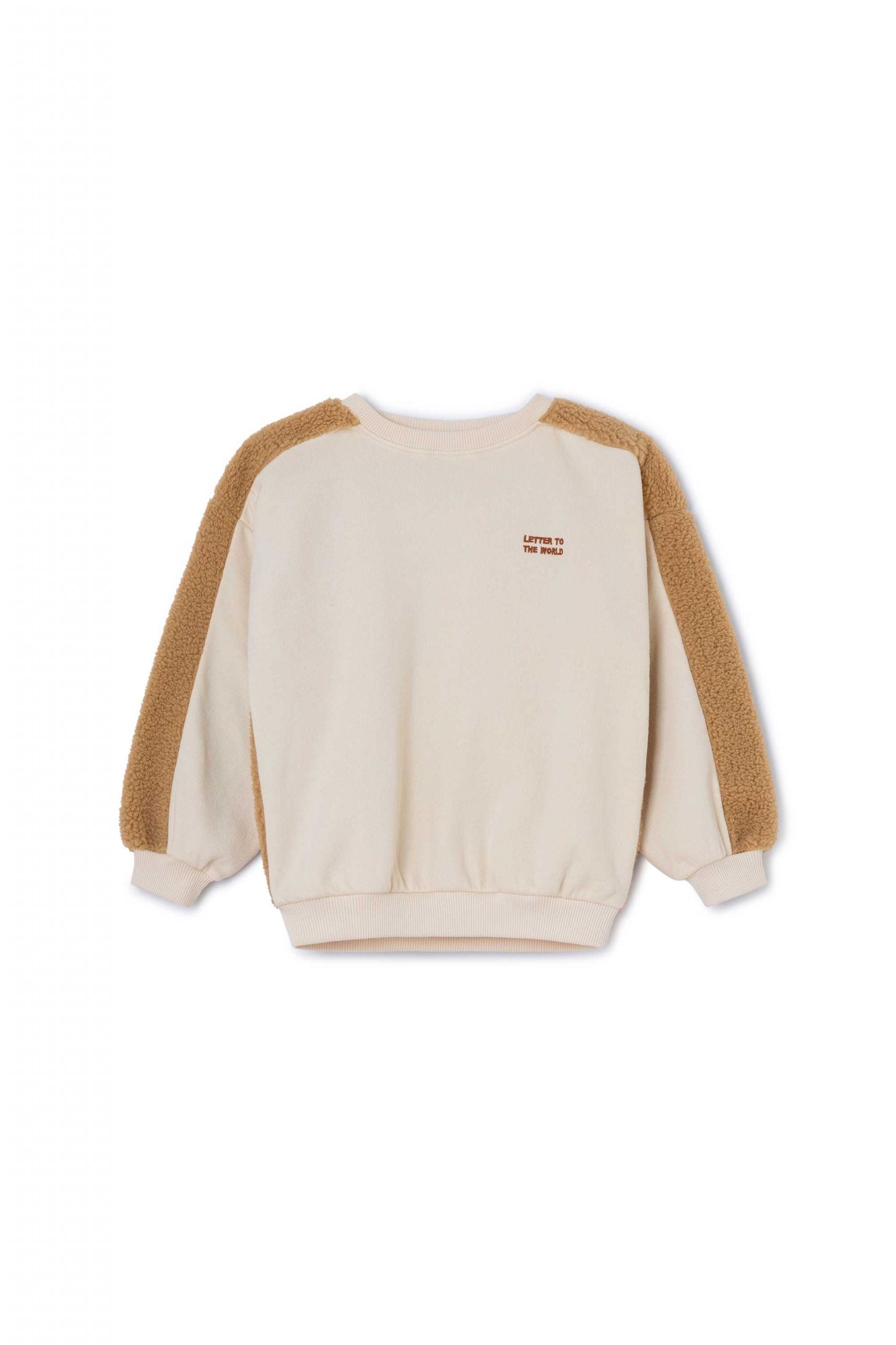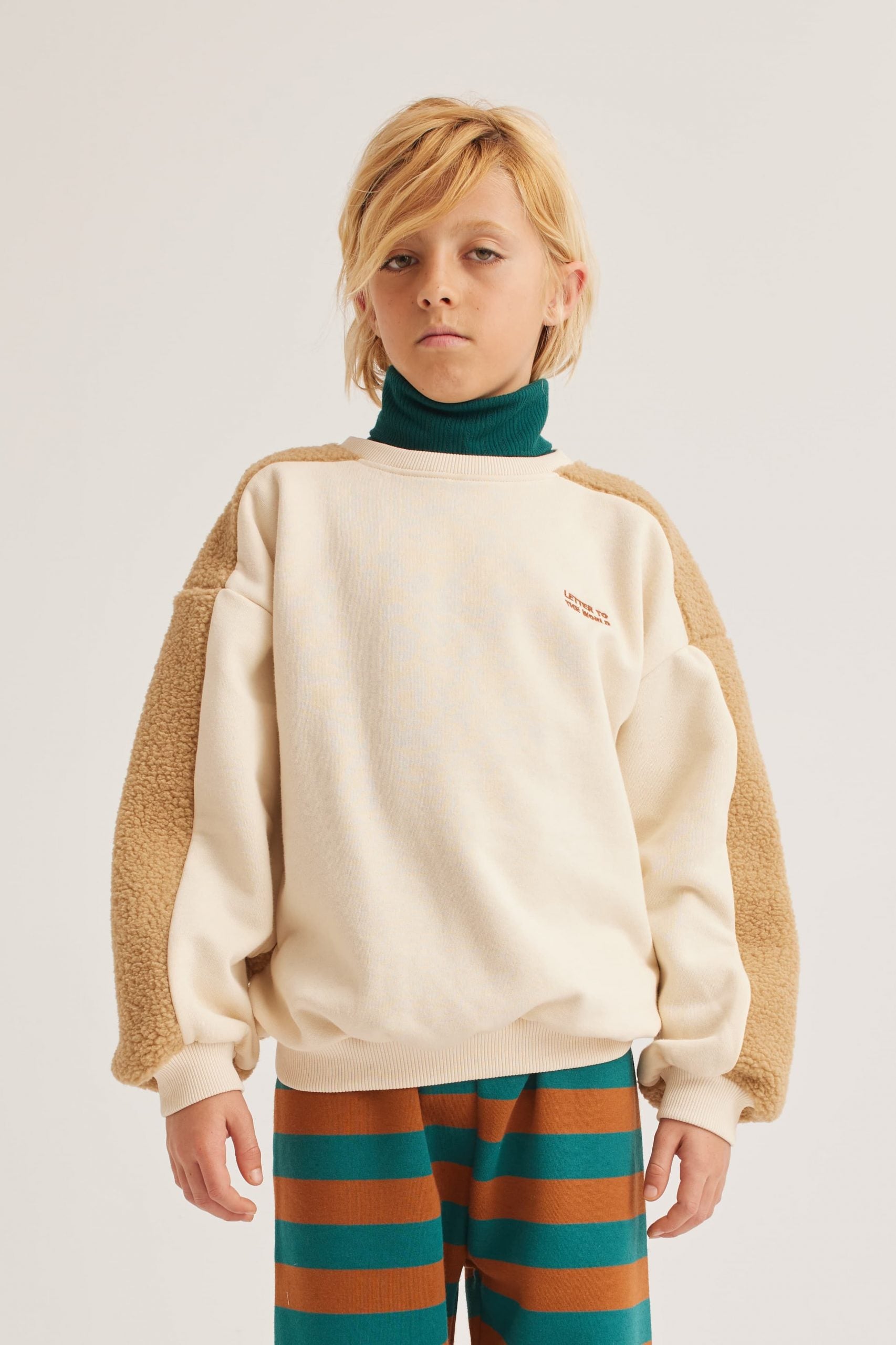 Description: 60 % organic cotton and 40 % polyester regular fleece and sherpa sweat in ivory color. Round neck and long sleeves with gingerbread vertical stripes on both sides and ribbed cuffs. Slightly oversized fit.