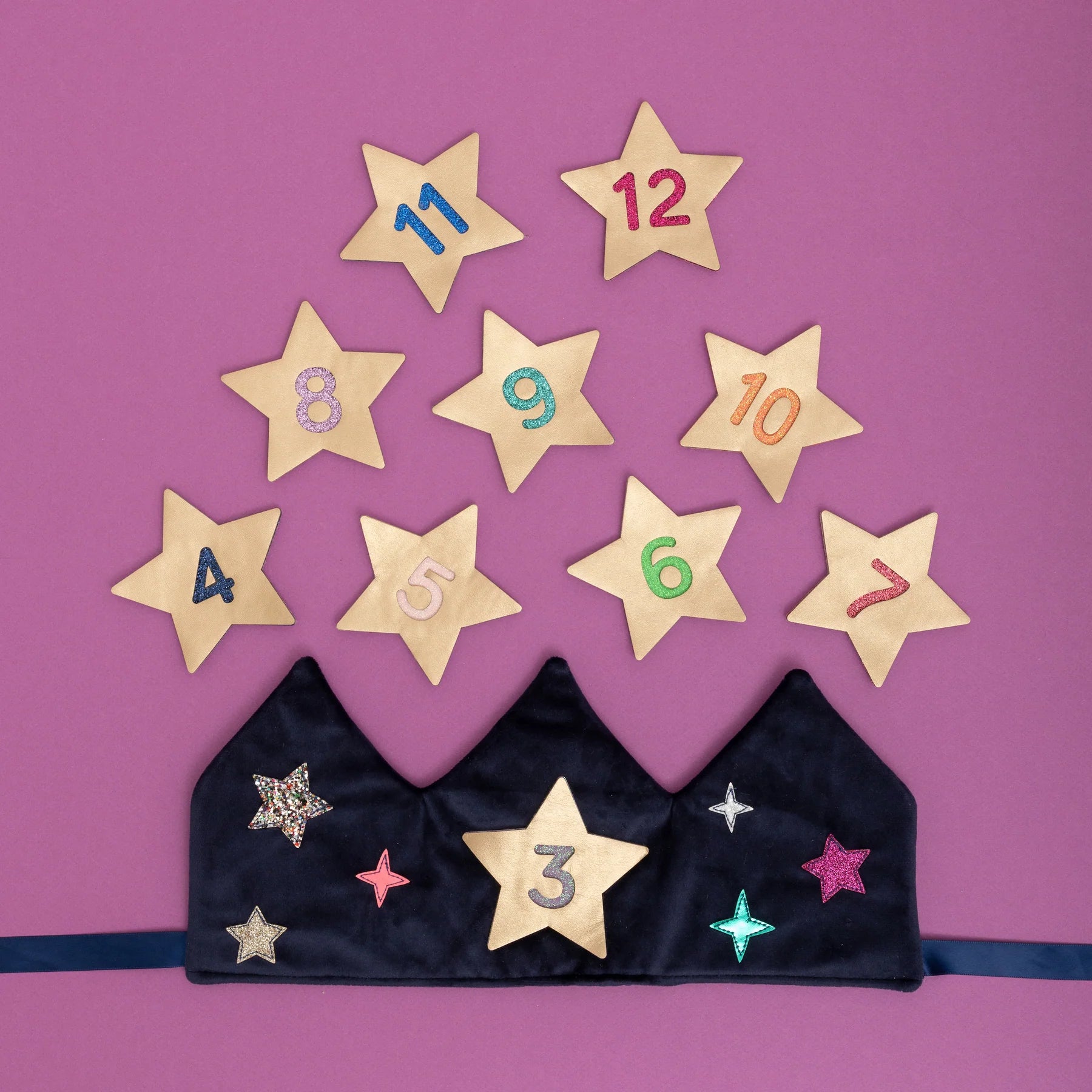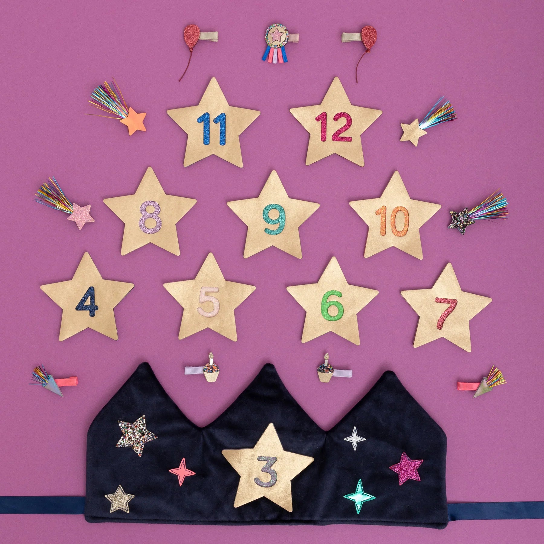 Includes ten metallic gold stars, with Velcro backing, numbered in colorful glitter for celebrating birthdays from 3-12 years.