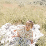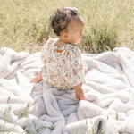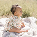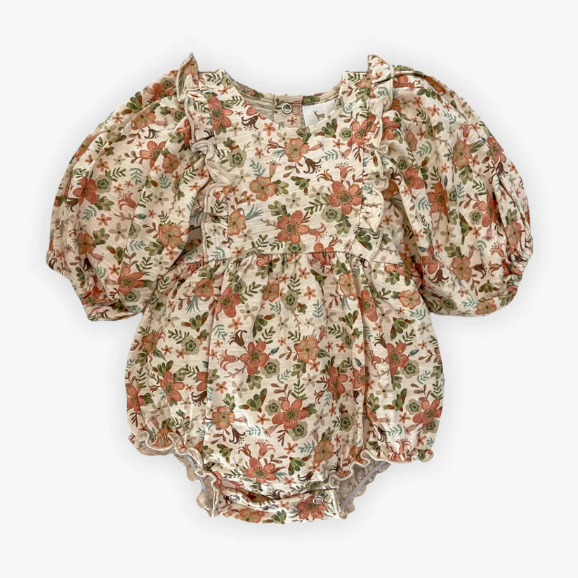 One-piece bubble/romper with bubble sleeve and ruffle chest detail.