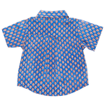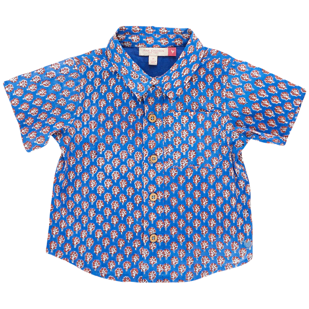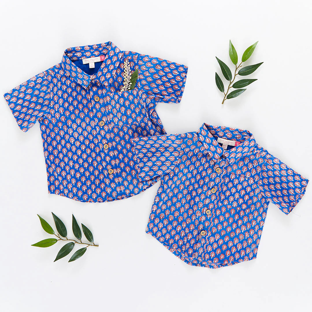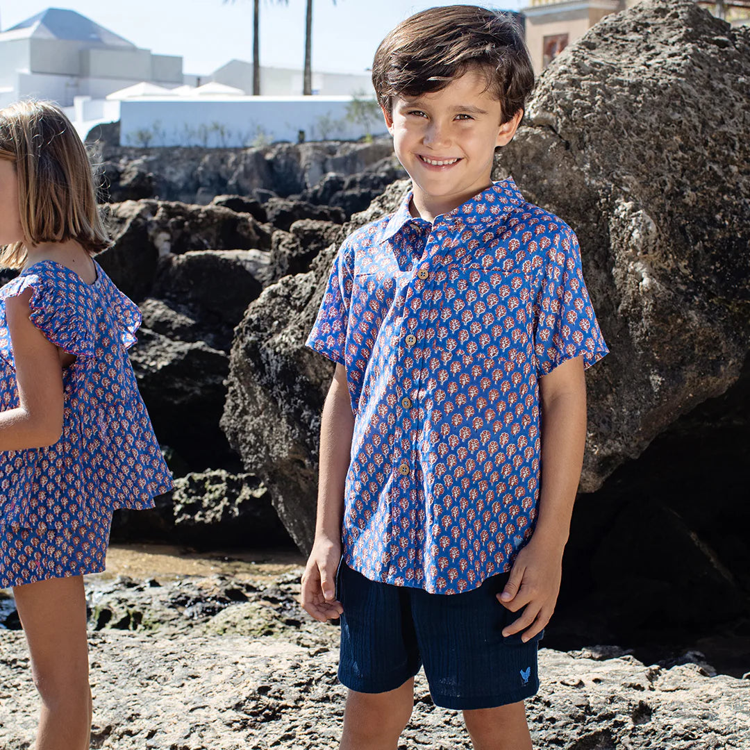 Vacation Vibes! This hand-blocked, traditional Indian block print transports you to the vibrant streets and plazas of one of Portugal's most charming cities. The crisp blue ground of our short sleeve Boys Jack Shirt is the perfect silhouette for this graphic field of coral and white flowers. Designer details include a pattern on pattern front chest pocket and a faux coconut button front closure.