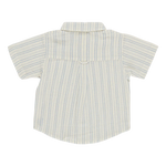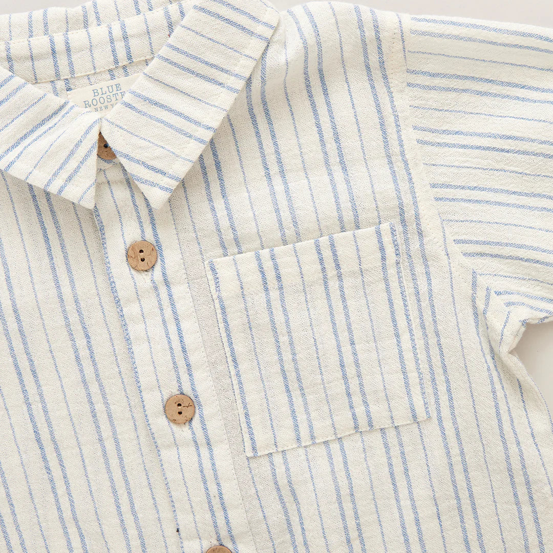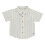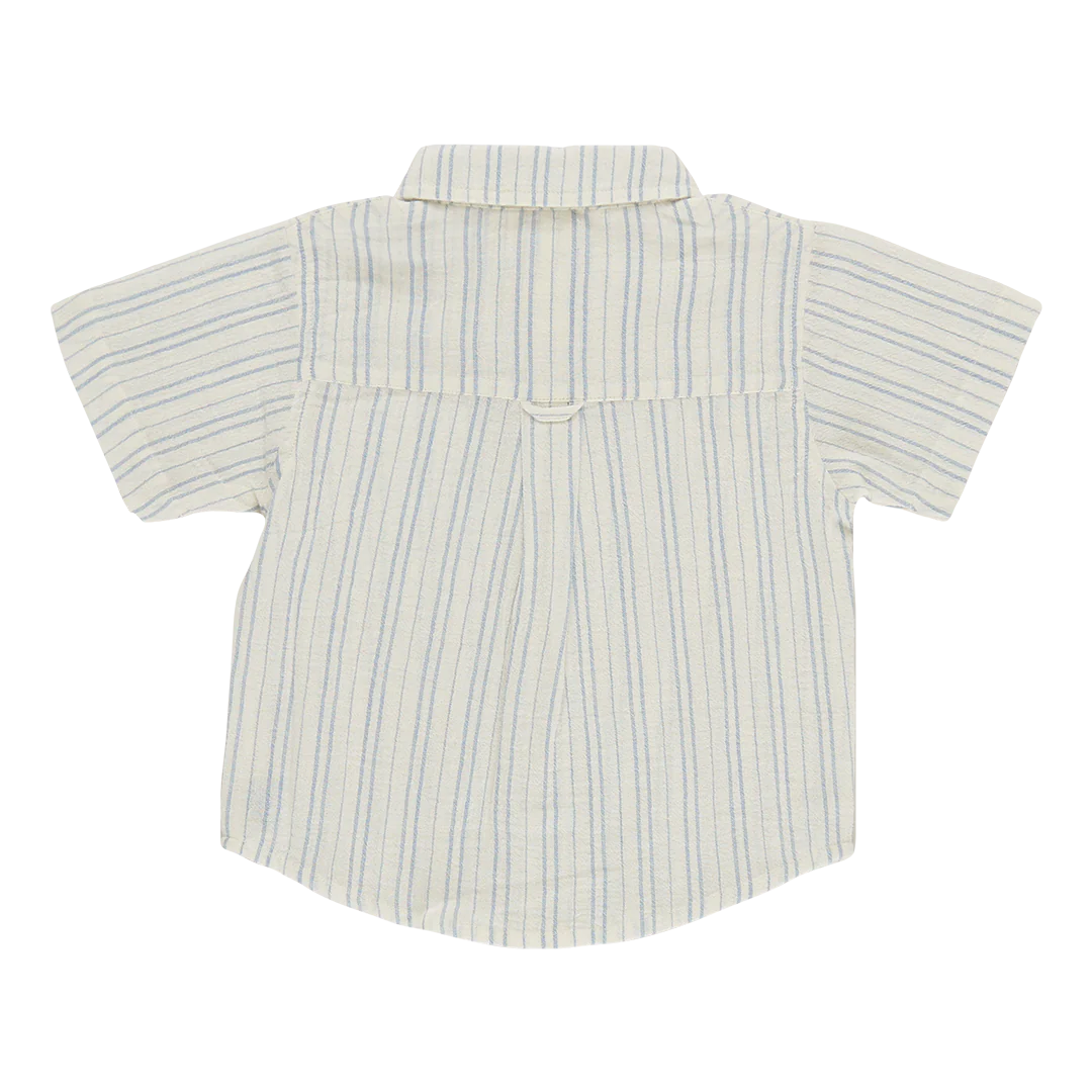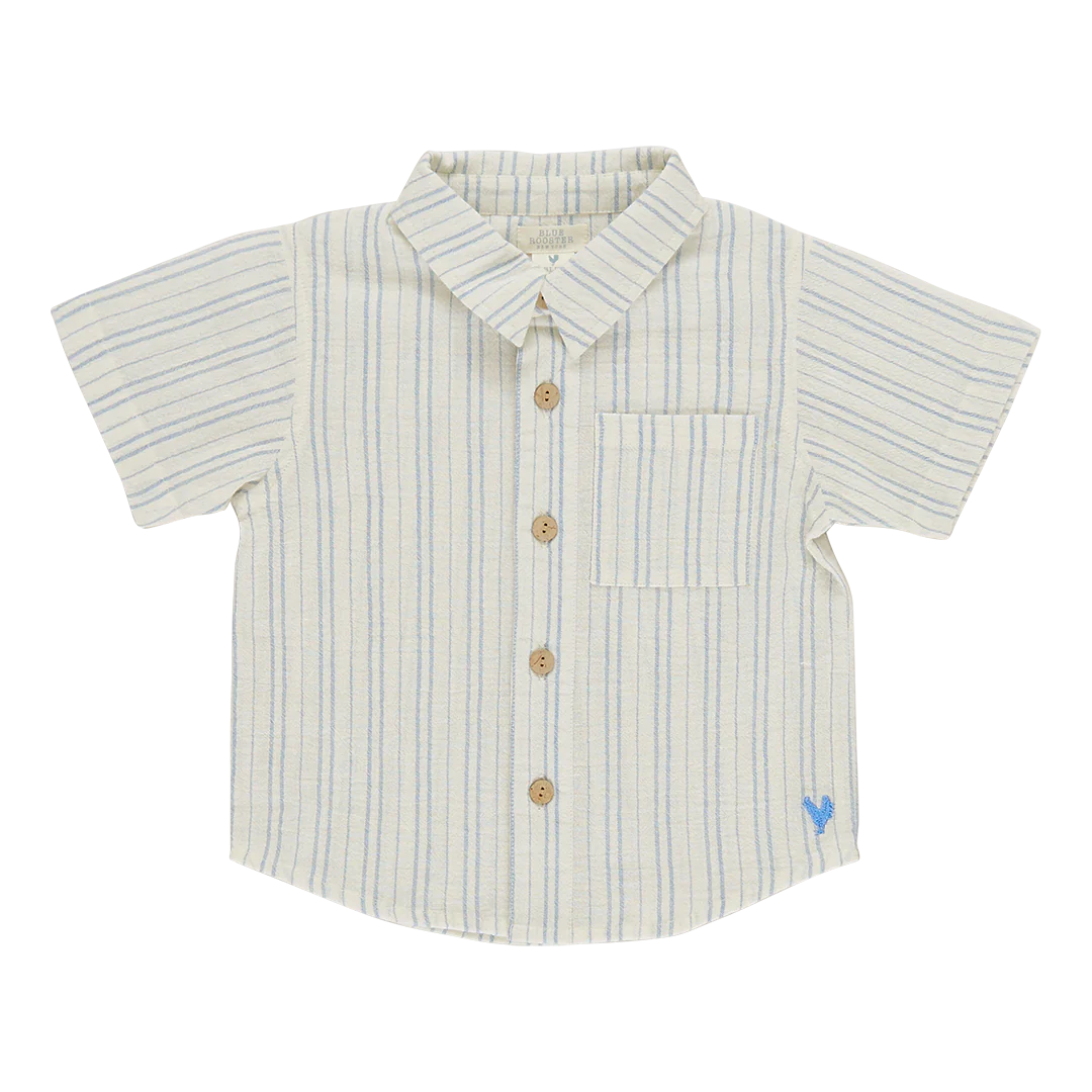 Classic Stripes! Thin and medium sky blue ribbons complement a sturdy white cotton gauze on our collection classic Boys Jack Shirt in Riviera Stripe.