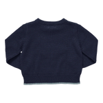 Dapper Duck! A handsome Mallard, set against a navy ground, stands ready for a fast-paced game of Duck,Duck,Goose on our Boys Oliver Sweater.