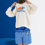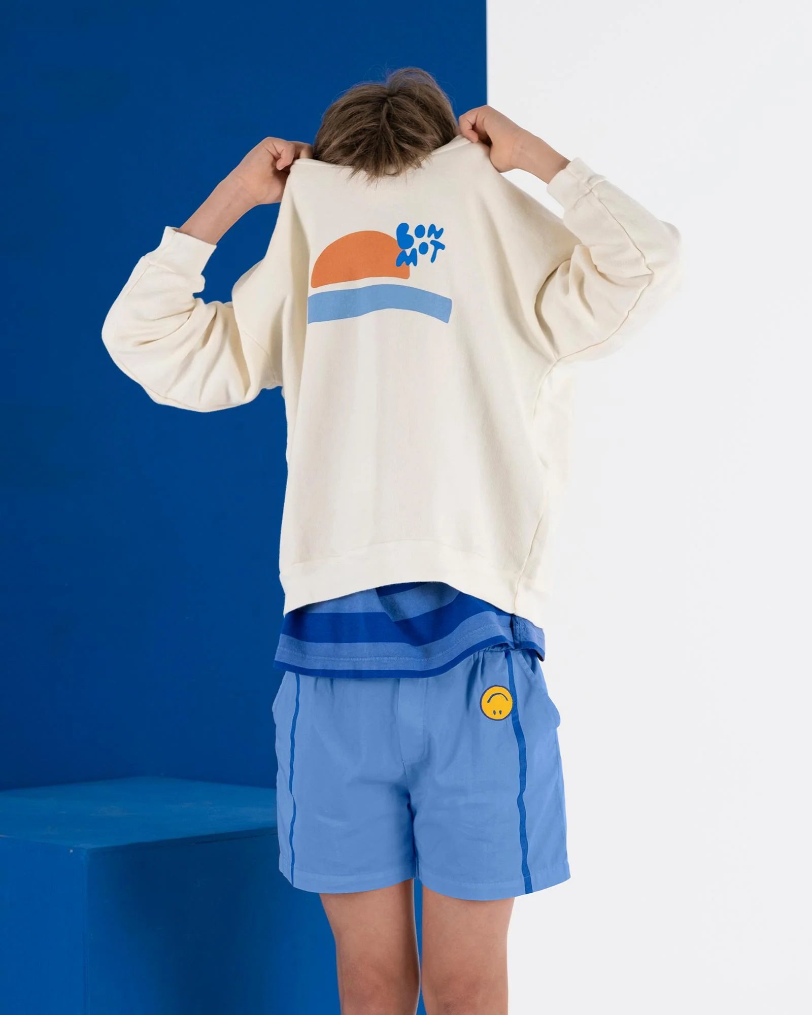 Short with elastic waistband and false button on the front. Front and back pockets, one vertical stripe on each side and smiley face embroidery on the top.
