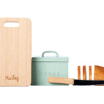 This miniature playset consists of a bread box, half a loaf of bread and 3 slices, a cutting board, and a knife. It is the perfect start of a play in the miniature kitchen.