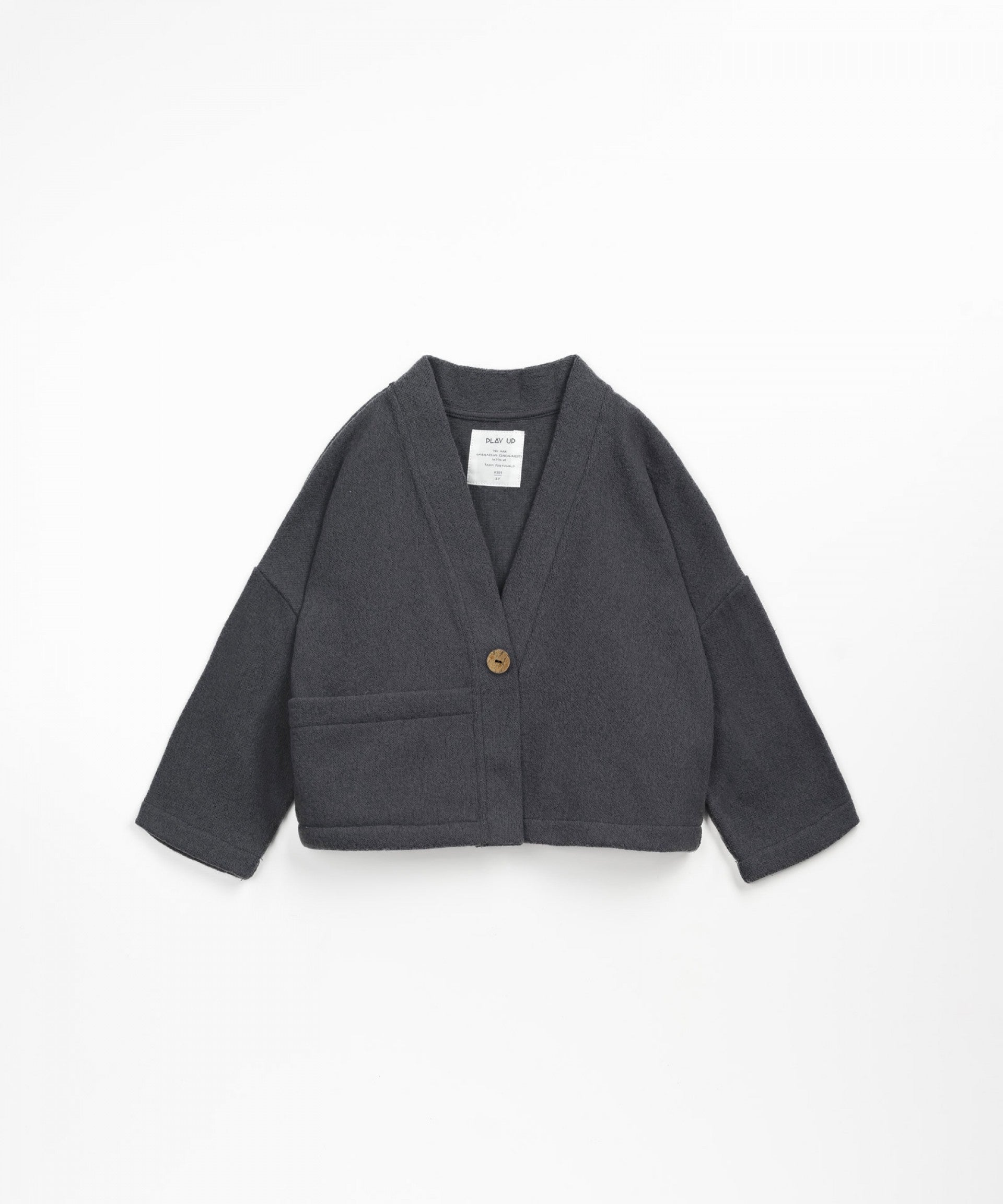 Details include: carding on the inside, a V-neckline, a front opening with a coconut button and a pocket.