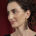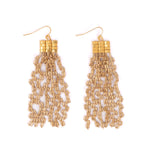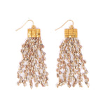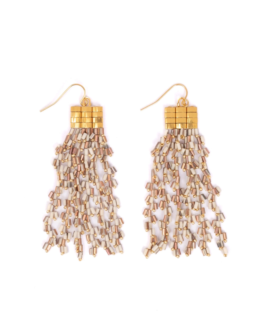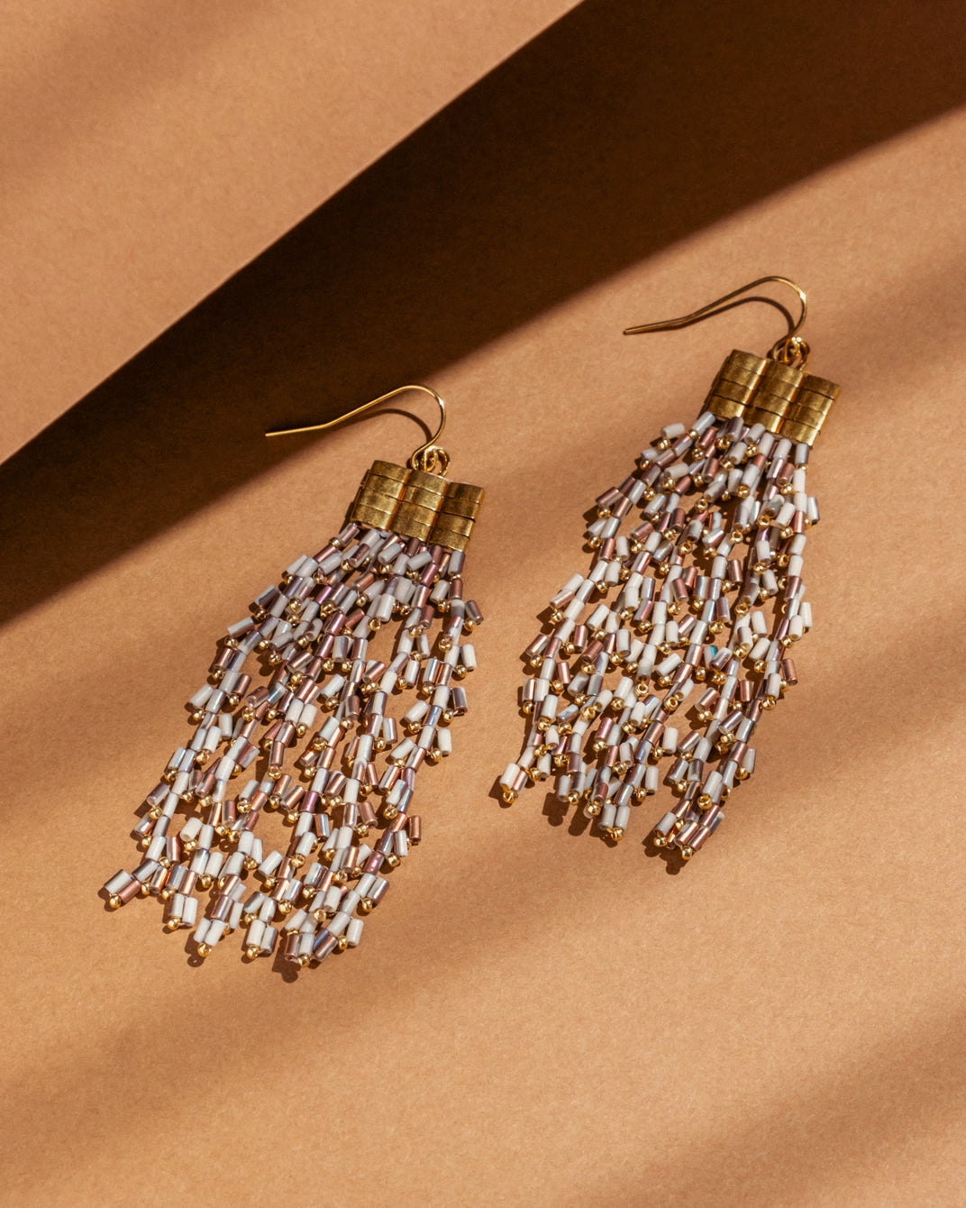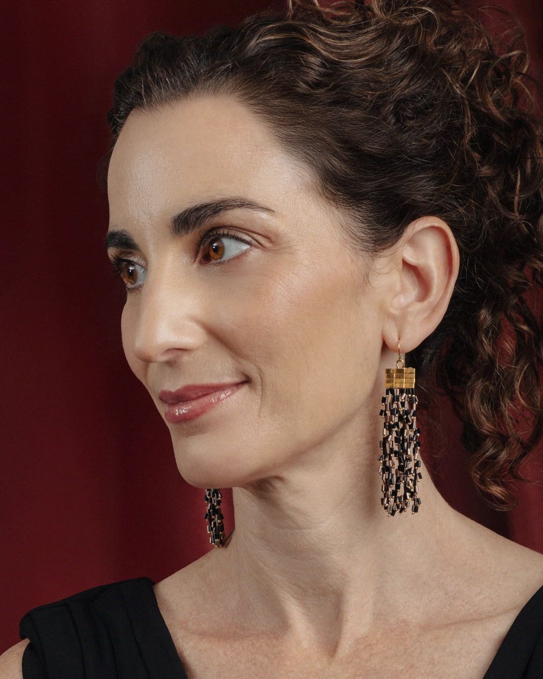 Combining artisanal craftsmanship with a modern edge, they are lightweight and eye catching. Made from premium Japanese glass beads, each earring is topped with woven 24K gold-plated Tila beads, from which hand-strung metallic specked tubular beads cascade. The movement is dramatic and fluid, creating a shimmering effect perfect to compliment festive holiday looks.