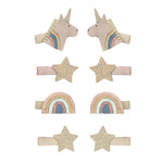 3cm ribbon wrapped alligator clips adorned with unicorns, rainbows and stars crafted from a pretty mix of soft velvet, glitter and metallic fabrics.