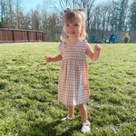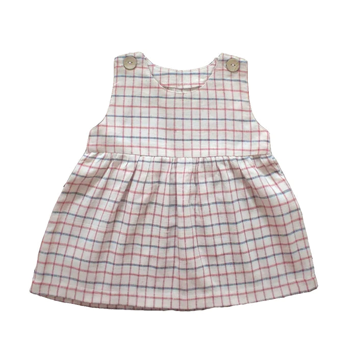 Cute coral and blue checks dress for the babies is made from hand-spun cotton yarn and hand-woven cotton fabric. It has been yarn-dyed with natural organic dyes found in nature. No synthetic chemicals added. The buttons are made from coconut shells. Designed for easy changes. Perfect for summer but can also be worn with a top and layers during colder days. The color and style make this dress a great all-season baby wear.