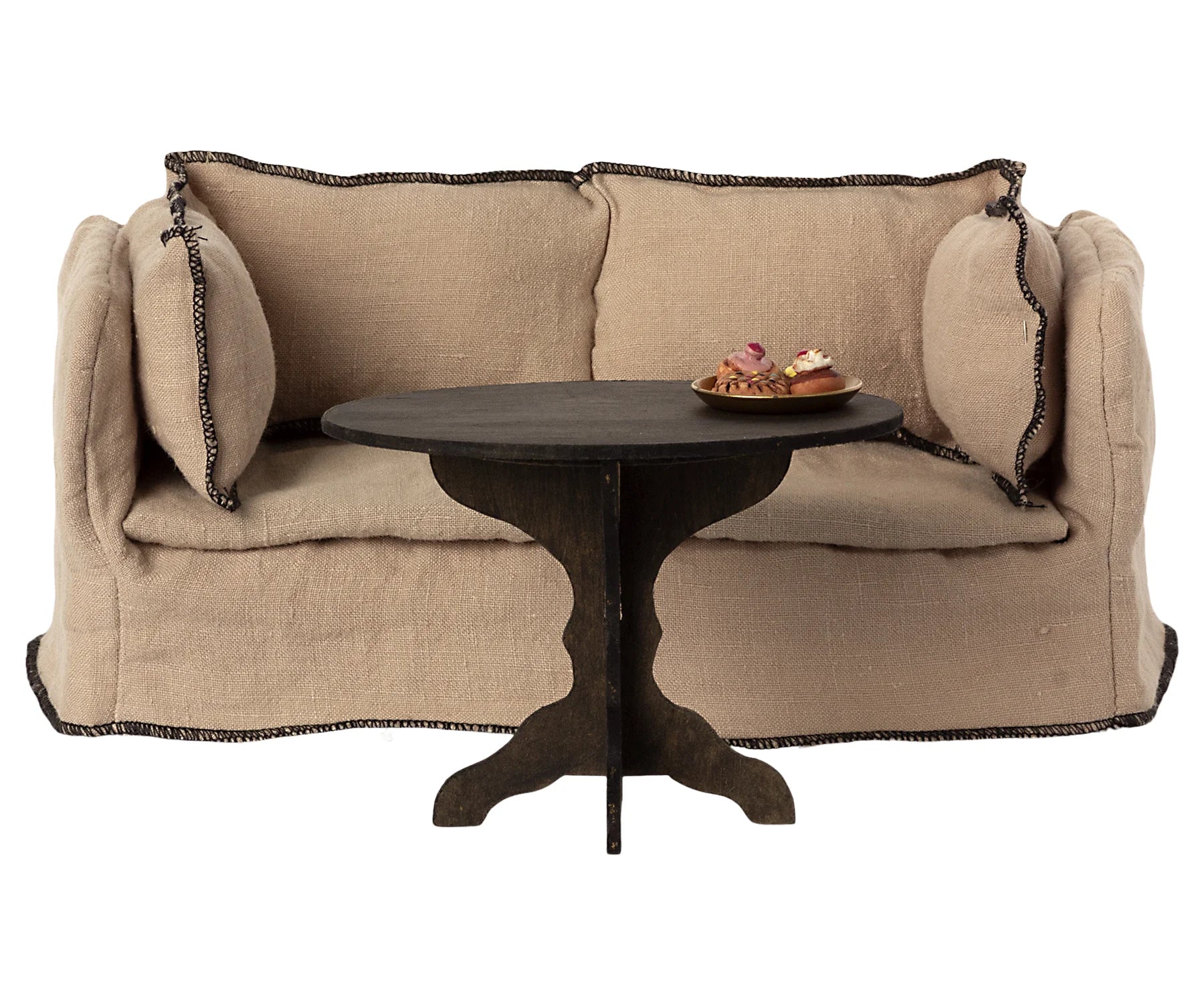 Coffee table made of wood and painted in anthracite color. It fits perfectly together with the couch and into the Maileg dollhouse. The table is delivered flat packed and is easily assembled so the play can soon begin.
