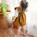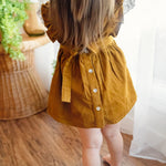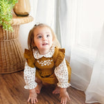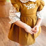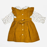 Floral embroidered pinafore dress in mustard corduroy, paired with peter pan collar floral printed muslin shirt as a set.