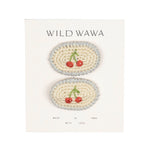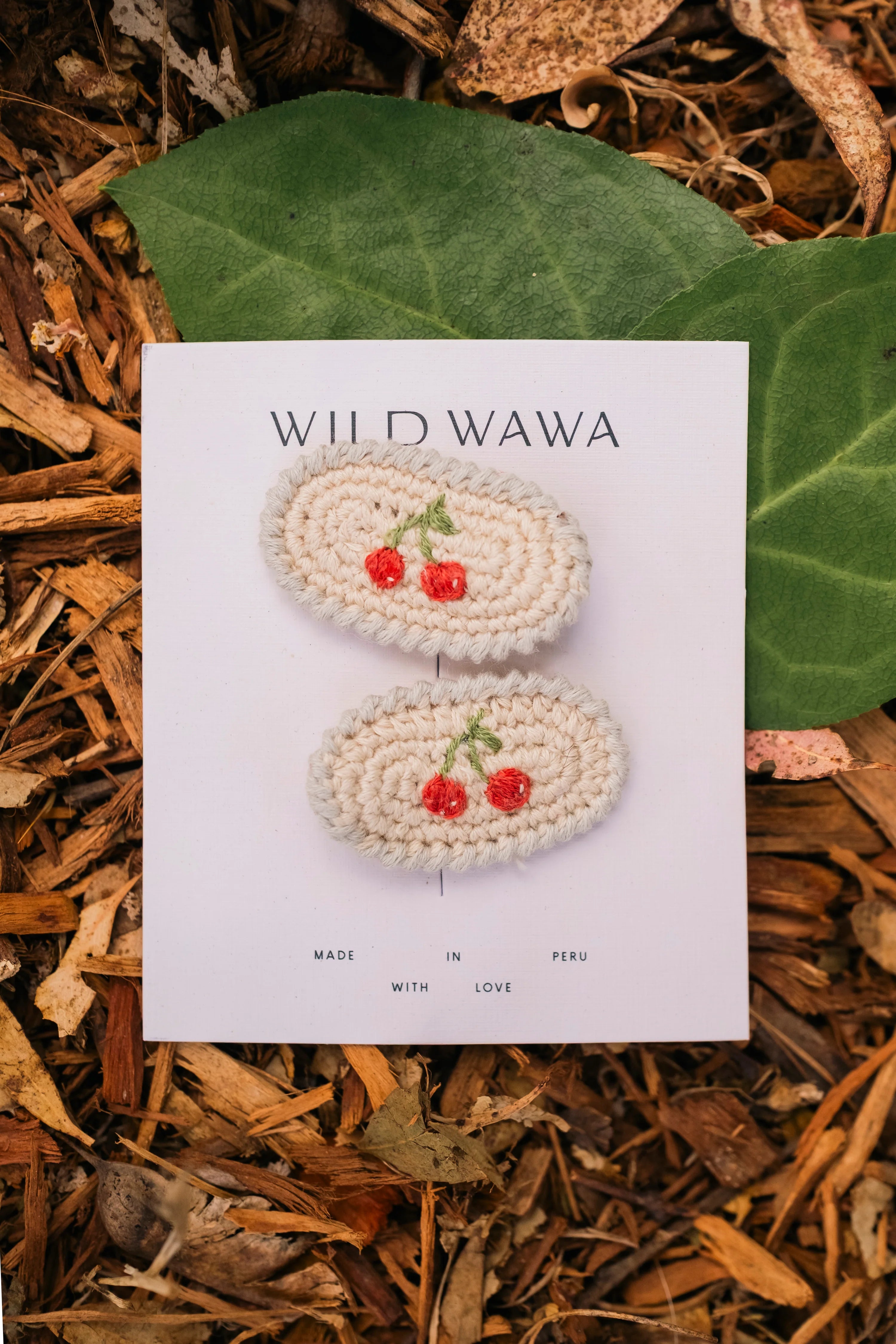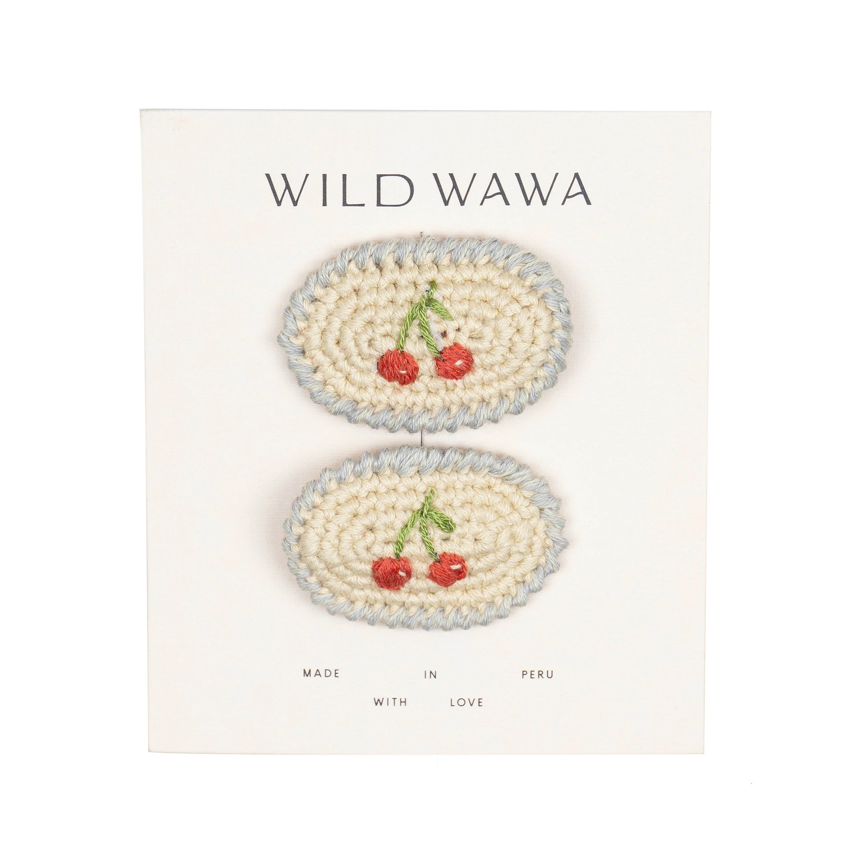 Holiday dreams in the sweetest details—our customer-loved crochet clip set features vintage-inspired cherry accents in vintage blue.