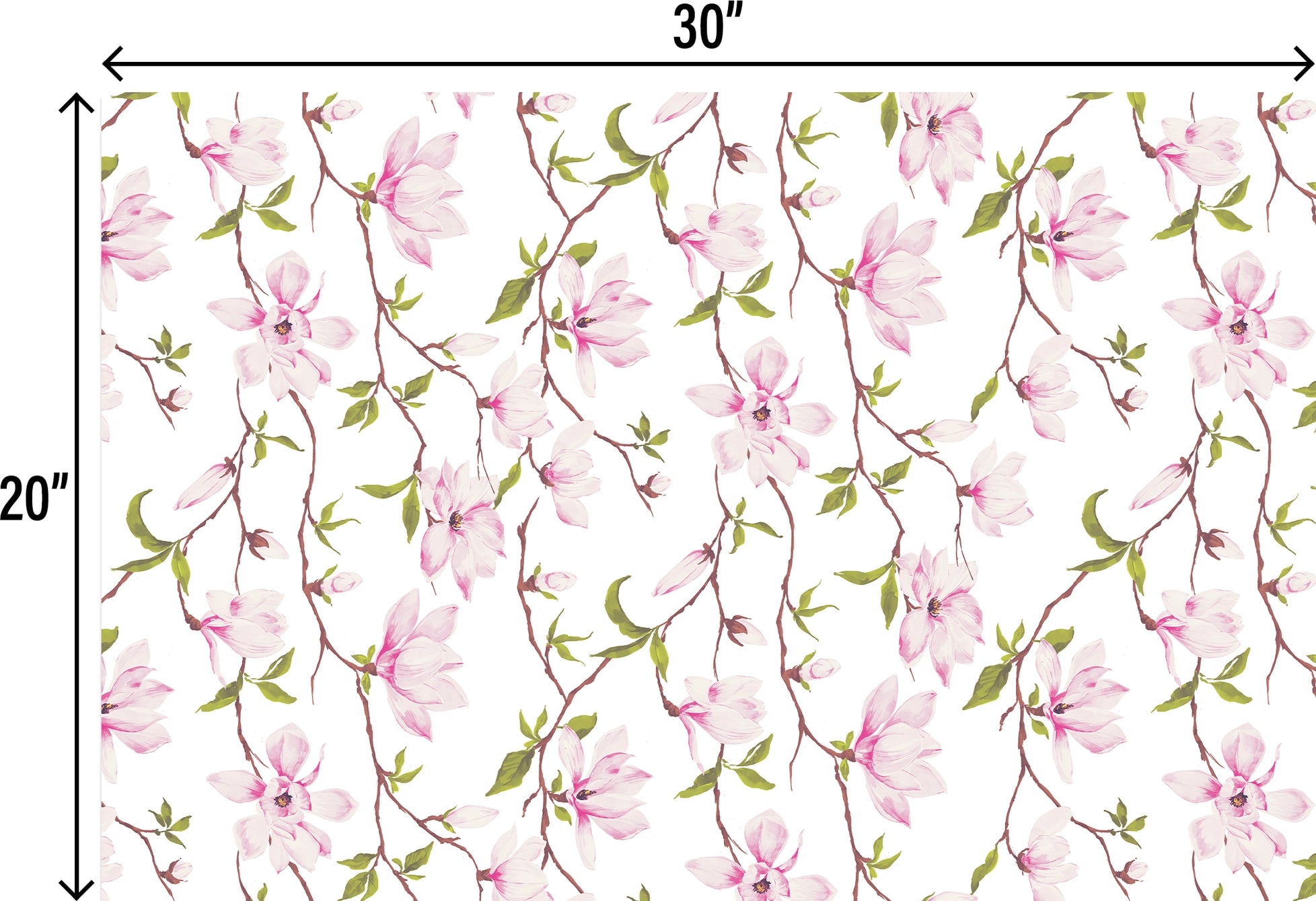 Graceful. Serene. Timelessly beautiful. Magnolia showcases delicate blush-pink blooms resting along softly painted branches, capturing the quiet elegance of spring in full bloom. The airy composition and refined watercolor style create a look that feels fresh, sophisticated, and effortlessly classic.