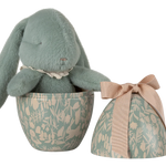 A sweet soft plush bunny with a vintage cotton collar around the neck, packed in a lovely metal egg with a beautiful print and a big soft bow on top - a perfect gift for the small ones!