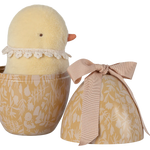 A sweet soft plush chicken with a vintage cotton collar around the neck, packed in a lovely metal egg with a beautiful print and a big soft bow on top - a perfect gift for the small ones!