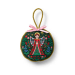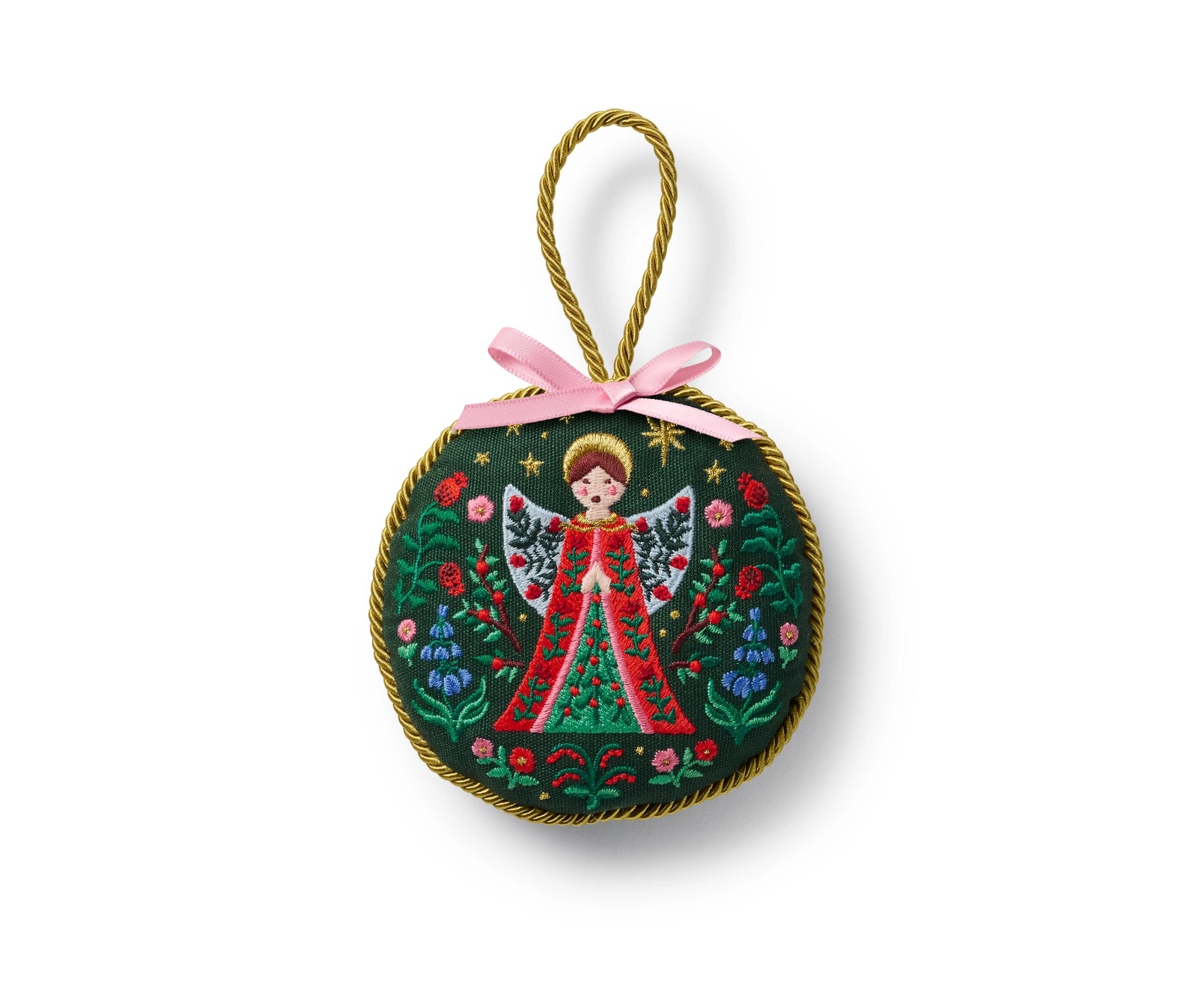 A keepsake gift or heirloom accent for your own tree, this ornament features embroidered illustrations, gold thread detailing, twisted piping, and a loop for hanging.