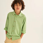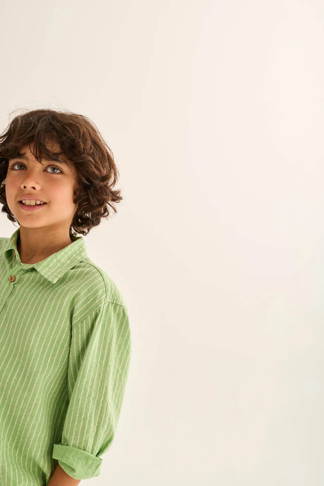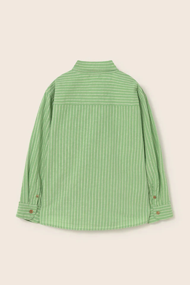 Boys’ striped shirt made from cotton fabric with a linen-like texture. It features a classic collar, a front button-down placket, a back yoke with horizontal stripes, and shirt-style cuffs with slit openings and plackets for a polished, classic look.