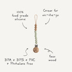 Made from 100% food-grade silicone, our clip features a faux wood silicone clasp that brings a modern take to a traditional favorite.