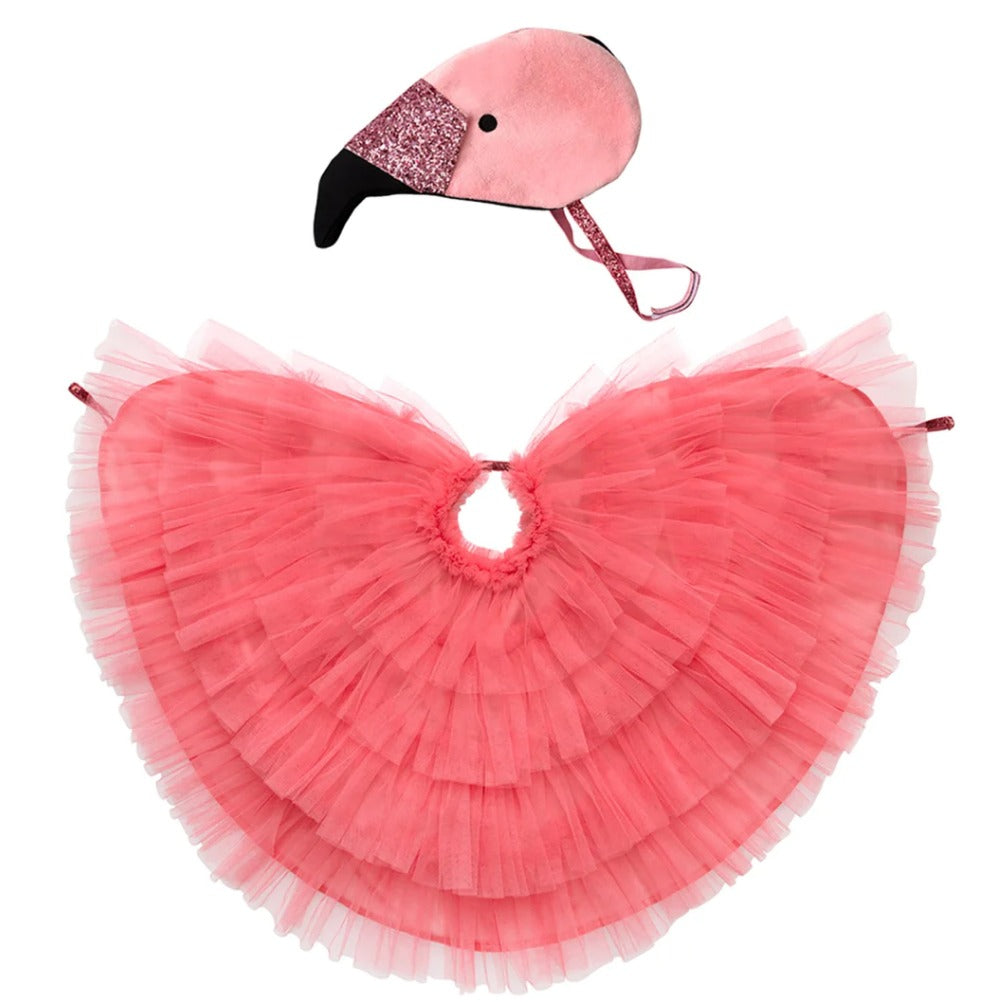 Let little ones fly away with this amazing flamingo dress-up kit. Featuring a sensational headpiece crafted from velvet, cotton, and glitter with sweet embroidered features. The wings are beautifully made from 3 tiers of pink tulle and ruffles, then finished with glittery wristbands.