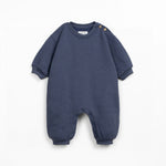 This jumpsuit is made from jersey with a blend of cotton, recycled cotton and recycled polyester, in a dark blue color.