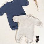 It features long sleeves, a round neckline, shoulder opening with coconut buttons and nickel-free metal snap fasteners between the legs.