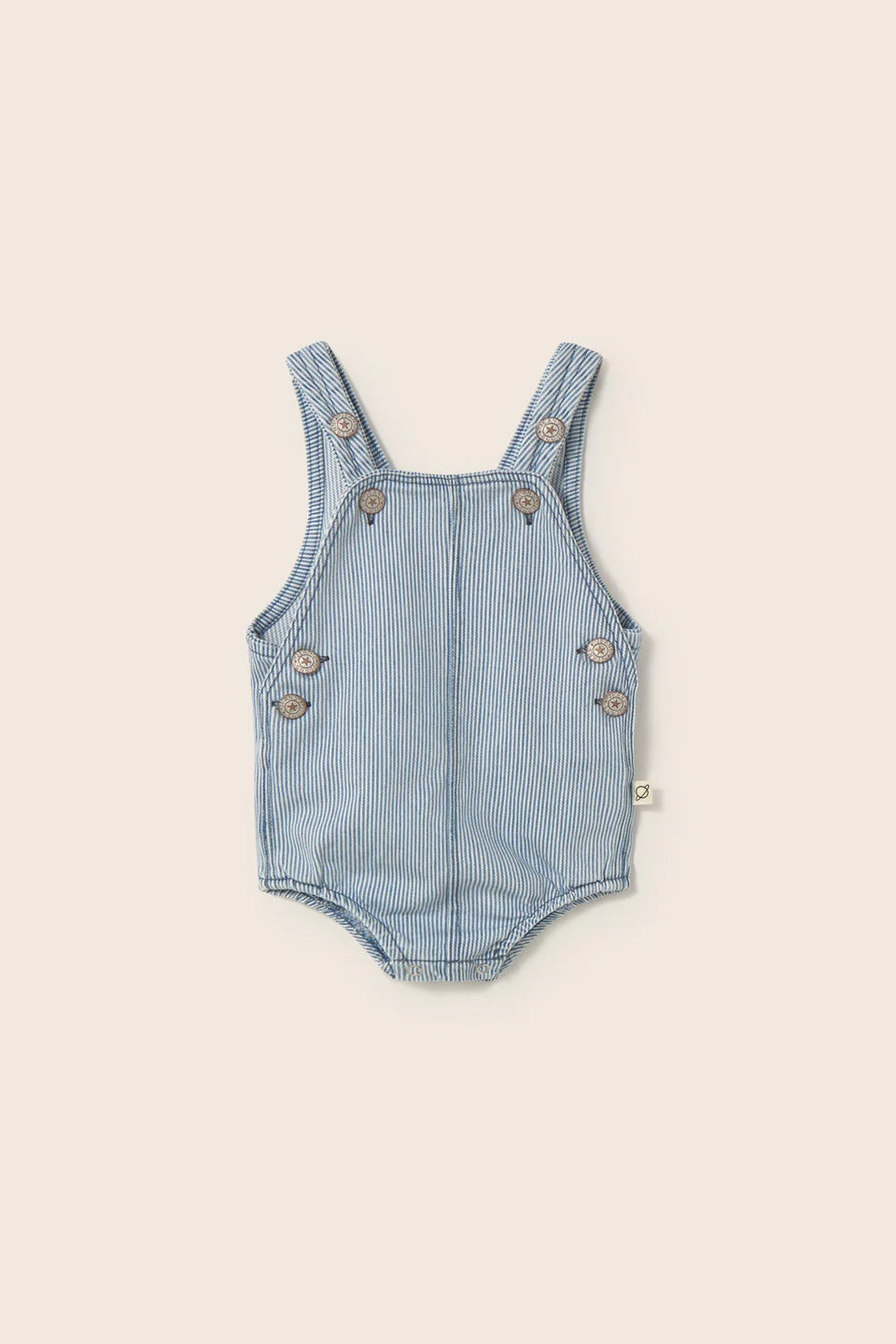 It features central seams at the front and back, double denim-style buttons at the waist on each side, elasticated leg openings, and snap buttons at the gusset for easy dressing.