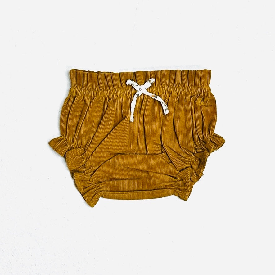 Floral printed natural base muslin dress with contrast mustard corduroy peter pan collar and other trim details, button in back.