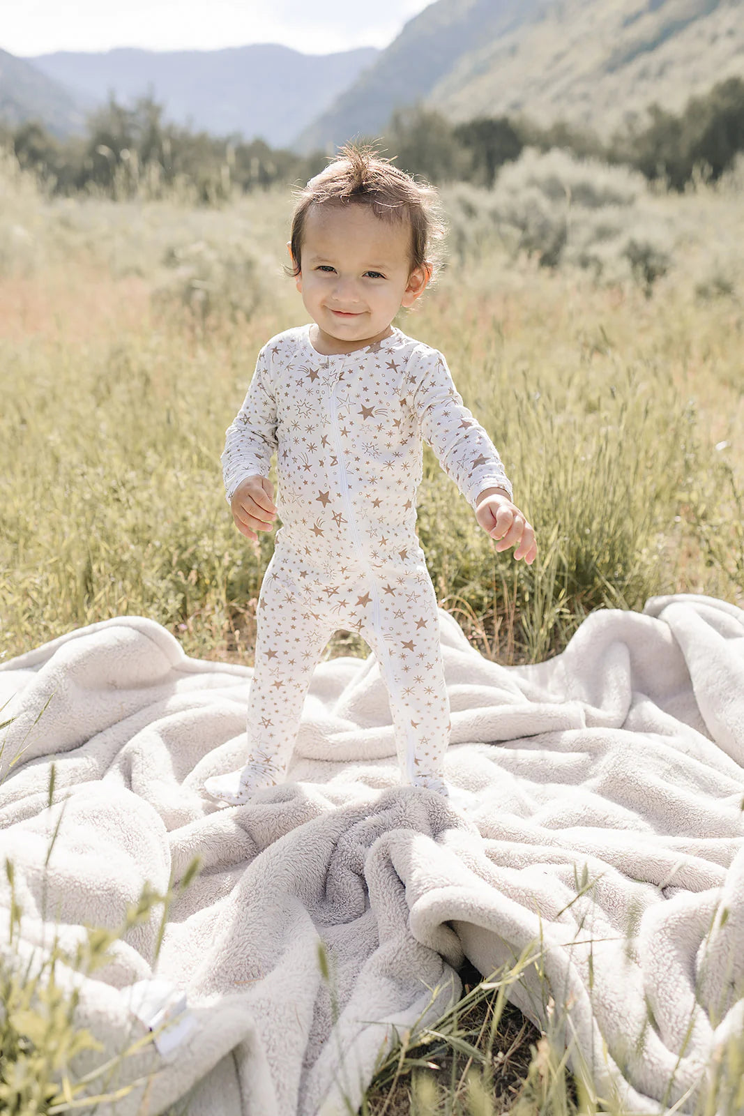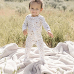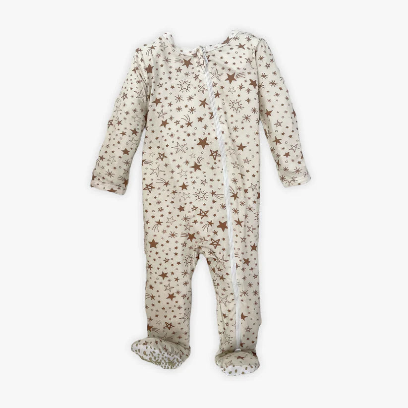 This footie features a front two way zipper for easy changing. Sleeve mitts and rubber soles.