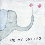 This lovely art print features a sweet elephant presenting two pink flowers. The phrase "For My Darling" is printed on the bottom - present this print as a gift for your darling.