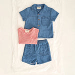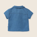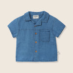 Baby shirt in textured cotton gauze with a denim-like finish. It features a camp collar with a button-down placket, front and back yokes, and short sleeves. Finished with a chest patch pocket and side slits for an easy, relaxed fit.