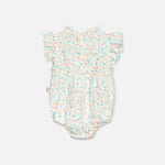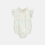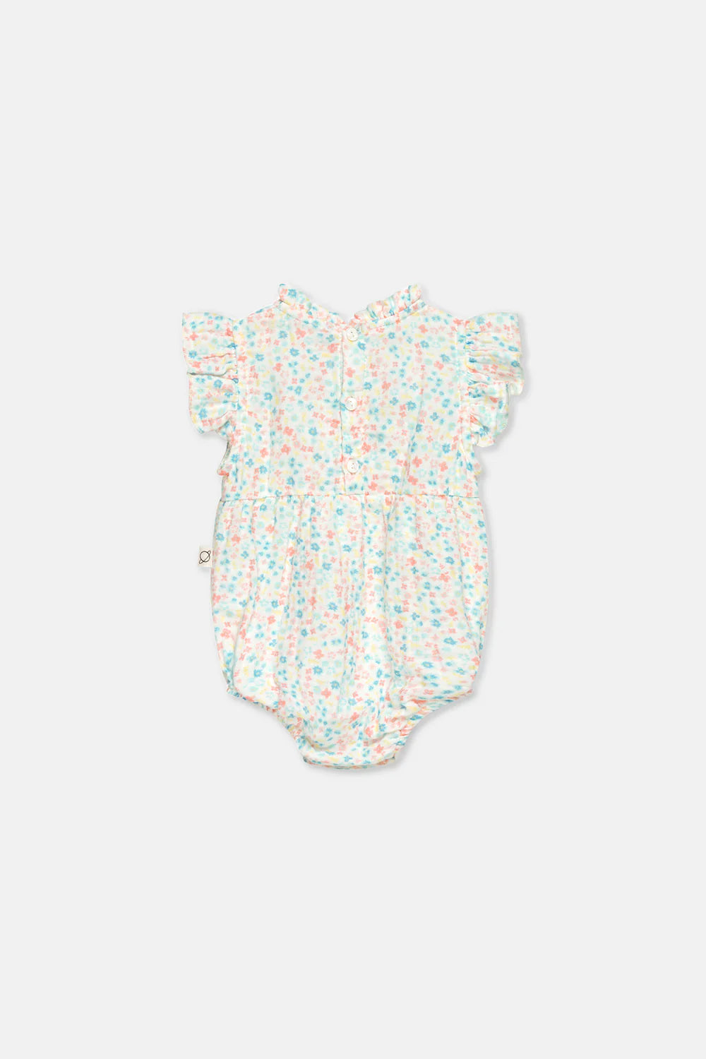 This organic gauze floral romper features a crew neck with ruffle details, flutter sleeves, and buttons at the back and the gusset. Gathered at the waist.