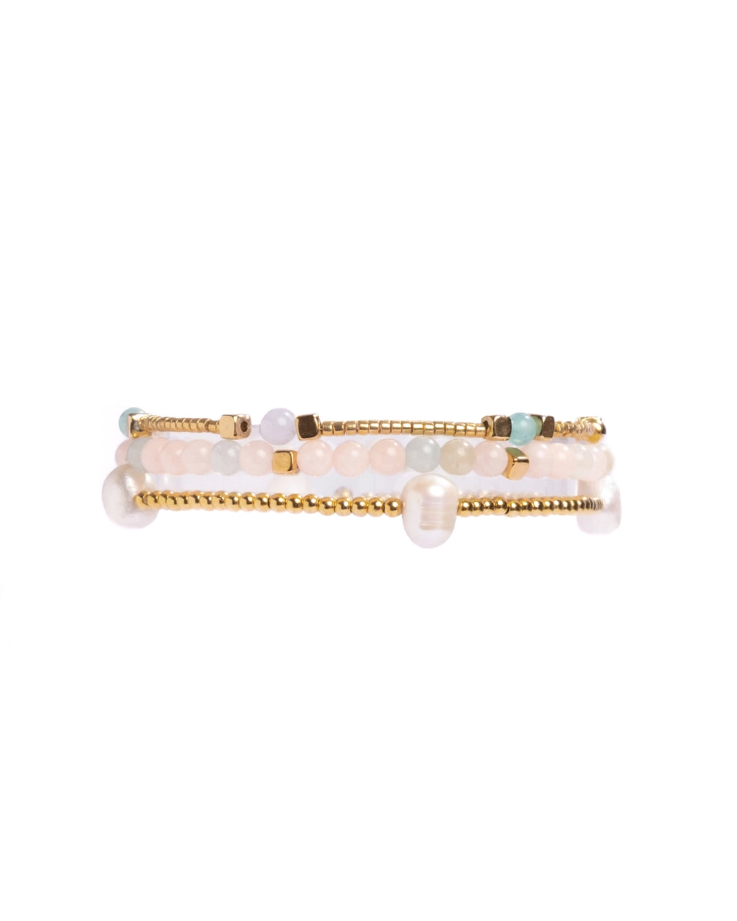 These stretch bracelet sets feature 3 unique bracelets that combine some of our favorite materials including semiprecious stones, river pearls and premium Japanese Miyuki glass beads.