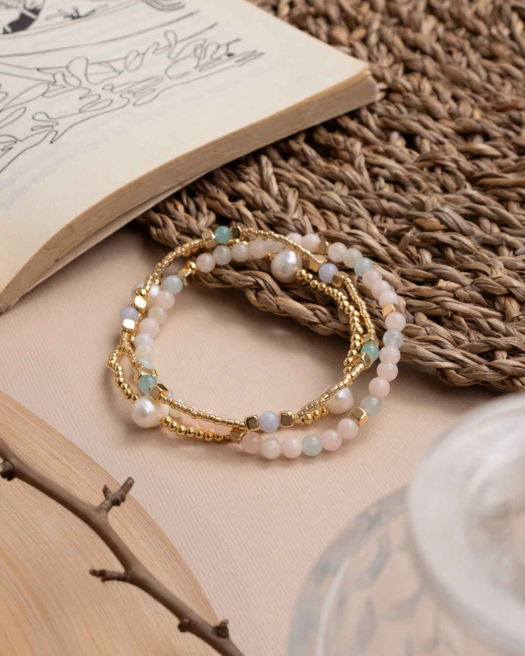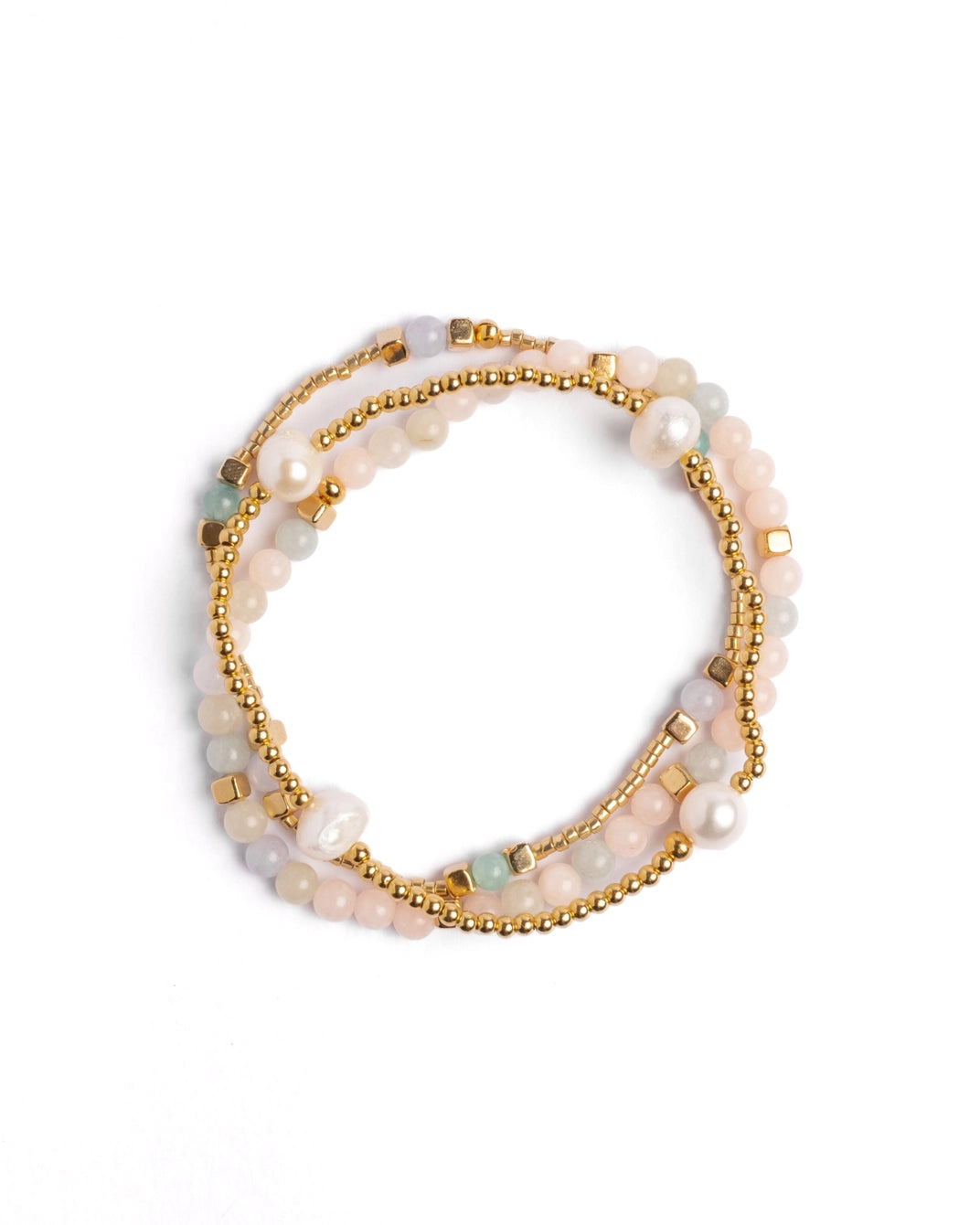 Materials: Miyuki Glass Beads, River Pearls, Morganite Apatite, Gold-Plated Beads.